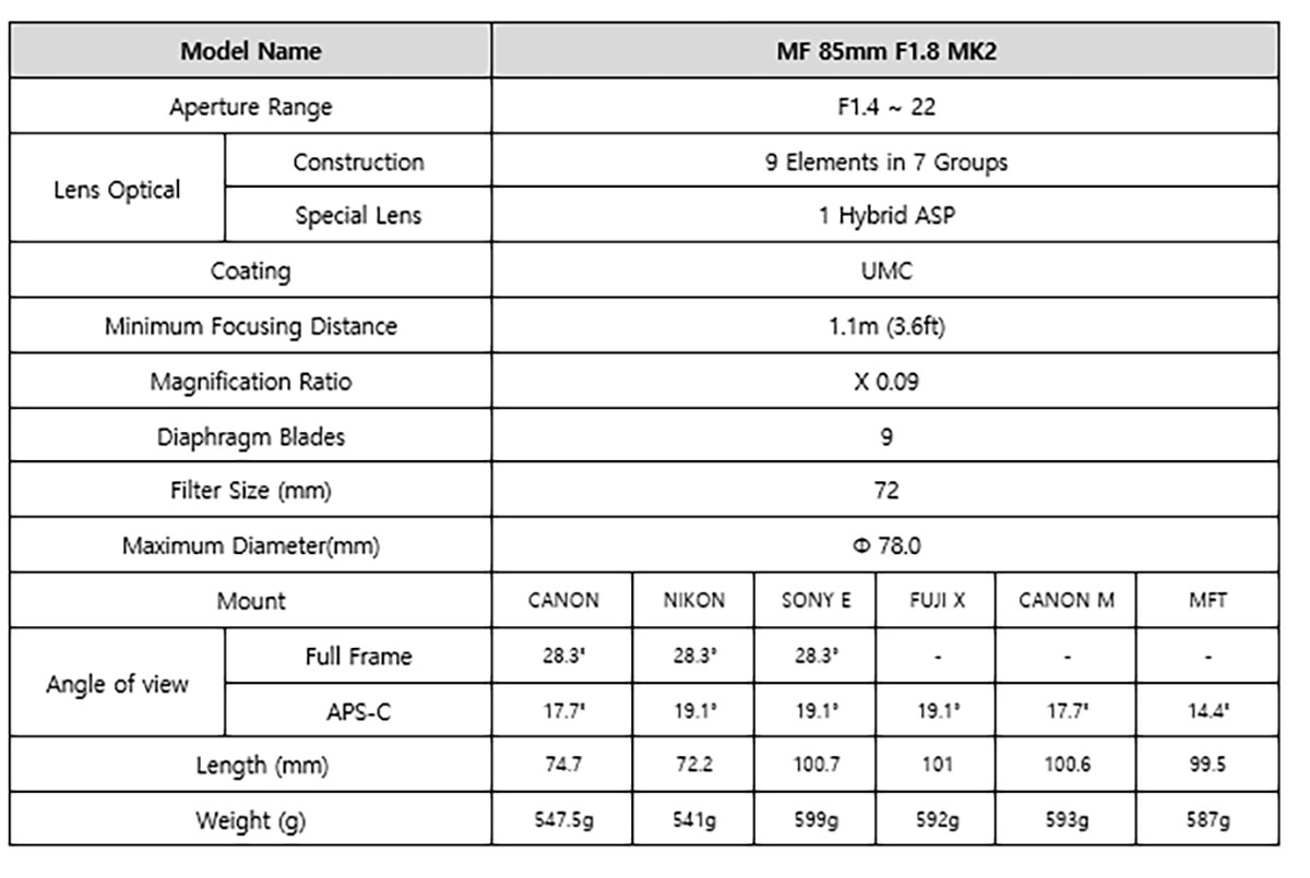 El modelo MF 85 mm F1.4 MK2 está compuesto por 9 lentes en 7 grupos, incluyendo un elemento asférico híbrido (H-ASP) y un revestimiento protector Ultra Multi Coating (UMC) en el elemento frontal. El diseño del objetivo garantiza una imagen nítida con un mínimo de aberraciones cromáticas.
