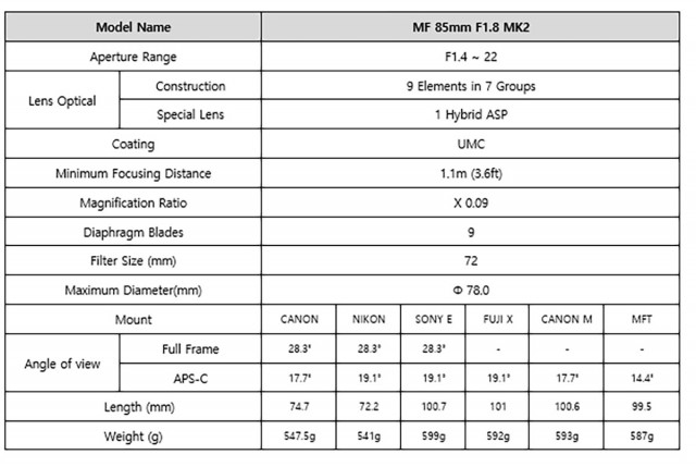 El Samyang MF 85 mm F1.4 MK2 es la nueva generación del popular objetivo manual para retratos, que ofrece una excelente reproducción del color y de la imagen fuera del plano de enfoque. A la venta en versiones para monturas Canon EF, Nikon F, Sony E, Fujifilm X, Canon M y MFT. La nueva versión MK2 tiene la misma construcción óptica que el modelo original, pero ahora ofrece resistencia a las inclemencias meteorológicas, un nuevo anillo de enfoque para un mejor agarre y un selector que permite ajustar la apertura de forma continua.