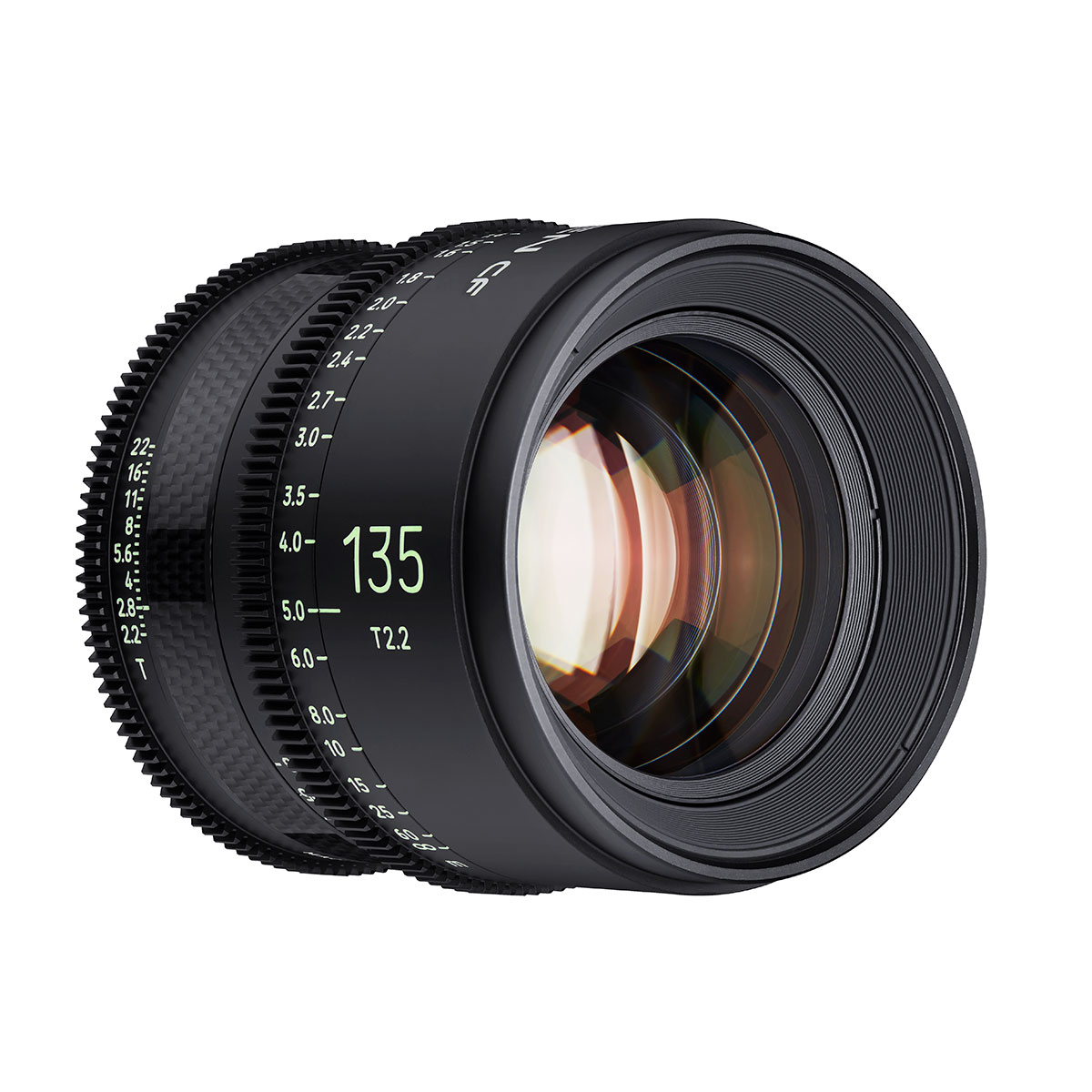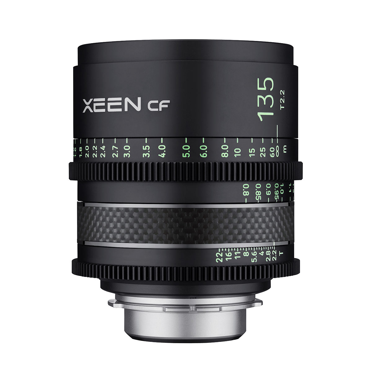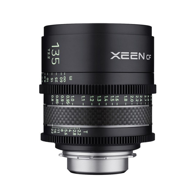 El objetivo manual para cine Samyang Xeen CF 135 mm T2.2 ofrece una alta resolución óptica (para los modernos sensores FF 4K/6K/8K), una construcción que incorpora elementos de carbono para reducir el peso sin perder resistencia, anillos dentados para el diafragma y el enfoque (rango de 200°), un tratamiento superficial X-Coating para reducir los reflejos y marcas luminiscentes de fácil lectura. Se fabrica en las versiones EF, FE y PL.