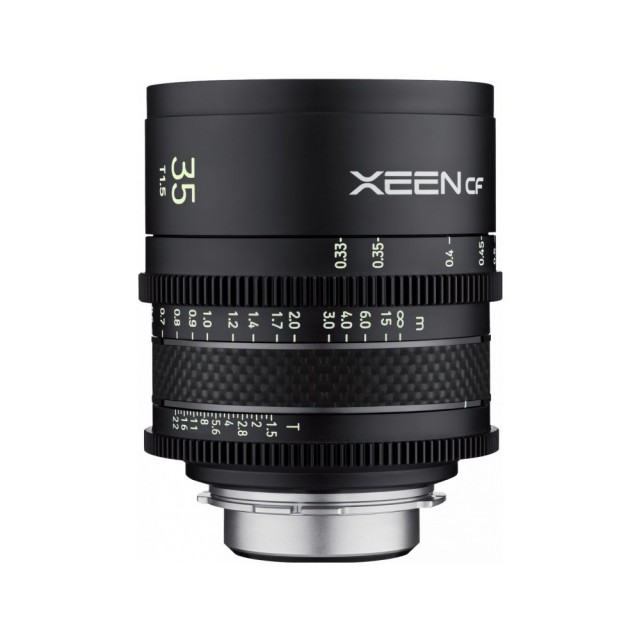 La gama de objetivos cinematográficos Xeen CF de distancia focal fija es compatible con los grandes sensores 4K y 8K de las últimas cámaras cinematográficas digitales, al tiempo que los objetivos conservan su peso ligero y sus dimensiones compactas. Gracias a ello, los productos de la gama Xeen CF pueden utilizarse con estabilizadores de cámara o drones y con una amplia gama de cámaras. La estructura exterior de material compuesto de carbono confiere a las lentes un peso reducido y una gran resistencia, además de un aspecto futurista.