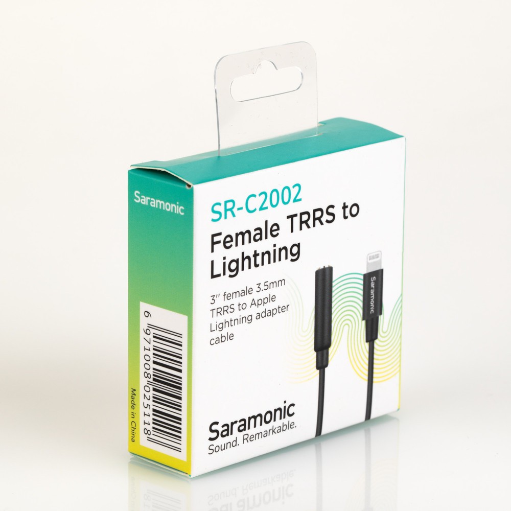 El Saramonic SR-C2002 es un adaptador de audio compacto y de alta calidad diseñado específicamente para iPhones y iPads con conector Lightning, que cuenta con un conector Lightning macho chapado en oro en un extremo y un conector TRRS hembra de 3,5 mm en el otro. Permite grabar sin interrupciones desde micrófonos TRRS, receptores inalámbricos y mezcladores de audio directamente en aplicaciones iOS compatibles, al tiempo que proporciona la alimentación necesaria para los micrófonos y sirve como salida totalmente funcional para auriculares con cable, incluyendo soporte para entrada de micrófono y control remoto: ideal para grabar vídeos, retransmisiones en directo y mejorar el sonido sobre la marcha sin comprometer la calidad de la señal.