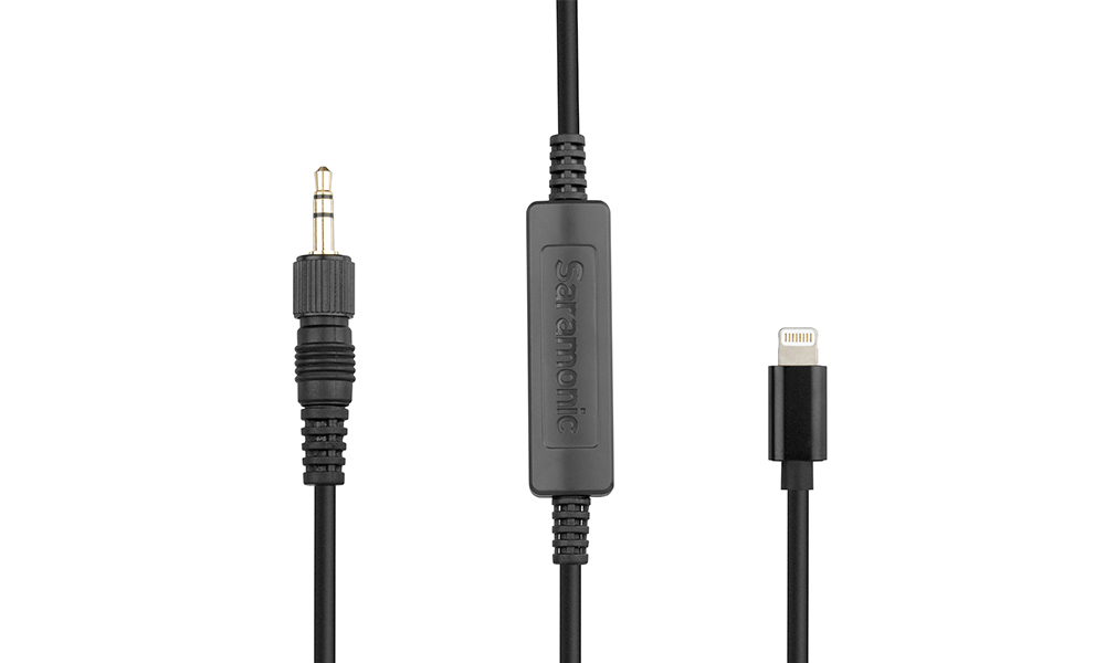Cable/adaptador para grabar audio en mono y estéreo mediante dispositivos móviles con iOS y a través de micrófonos o preamplificadores con salida de 3,5 mm. El conector de 3,5 mm con tuerca de seguridad también es compatible con los micrófonos inalámbricos Saramonic UwMic9, VmicLink5 y SR-WM4C, así como con el micrófono Vmic y otros con salida estándar de 3,5 mm.