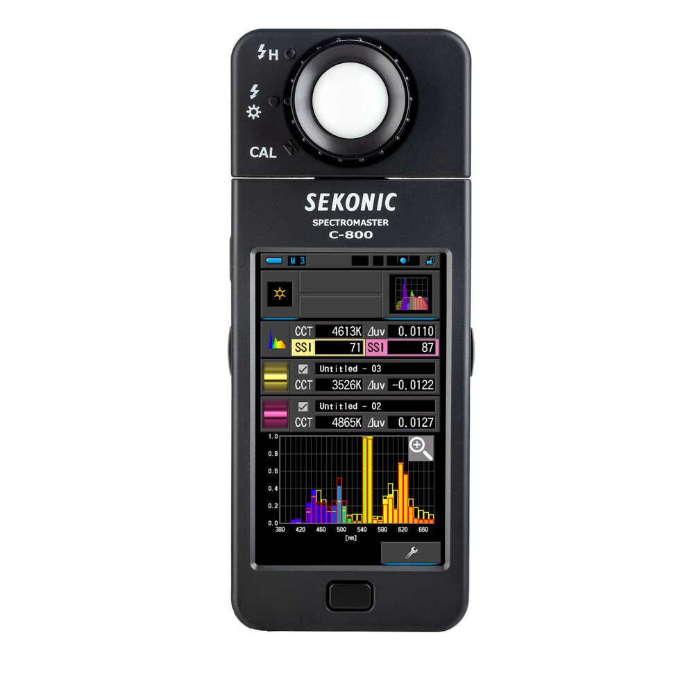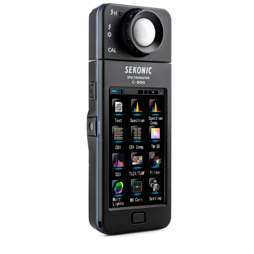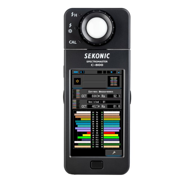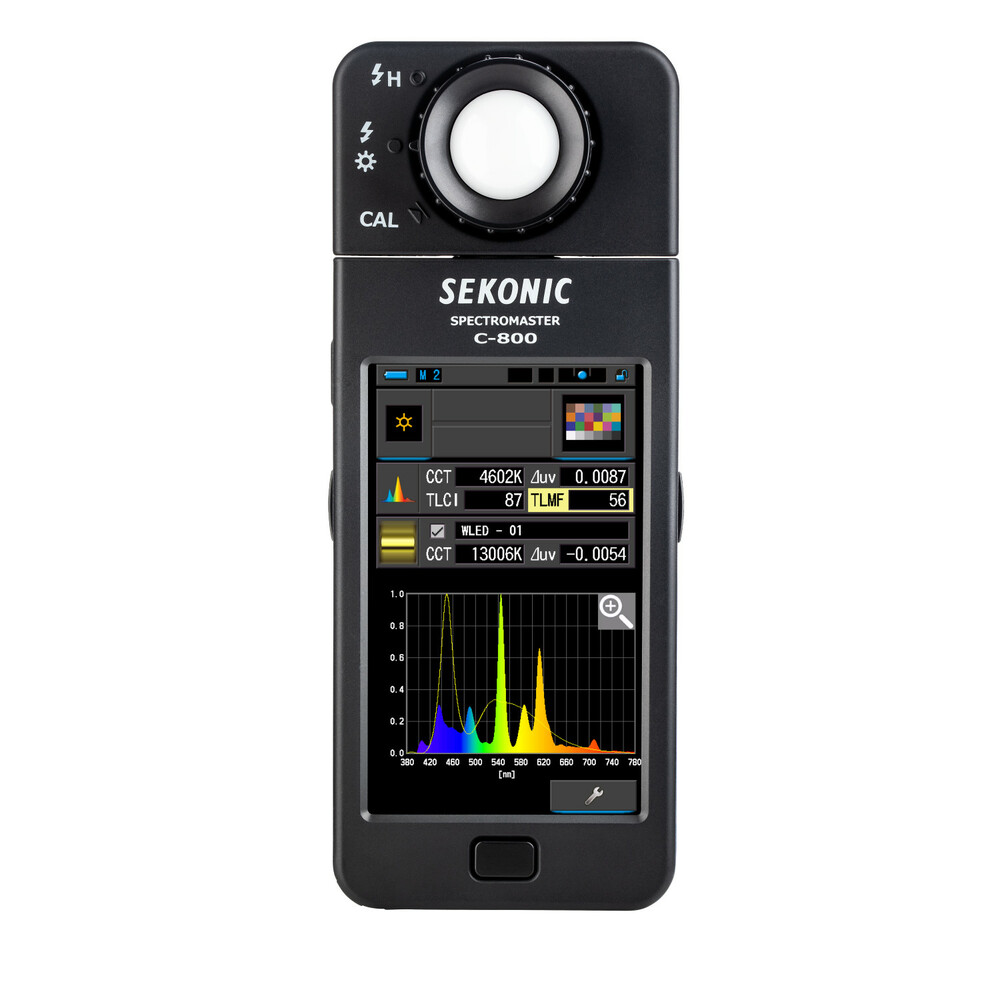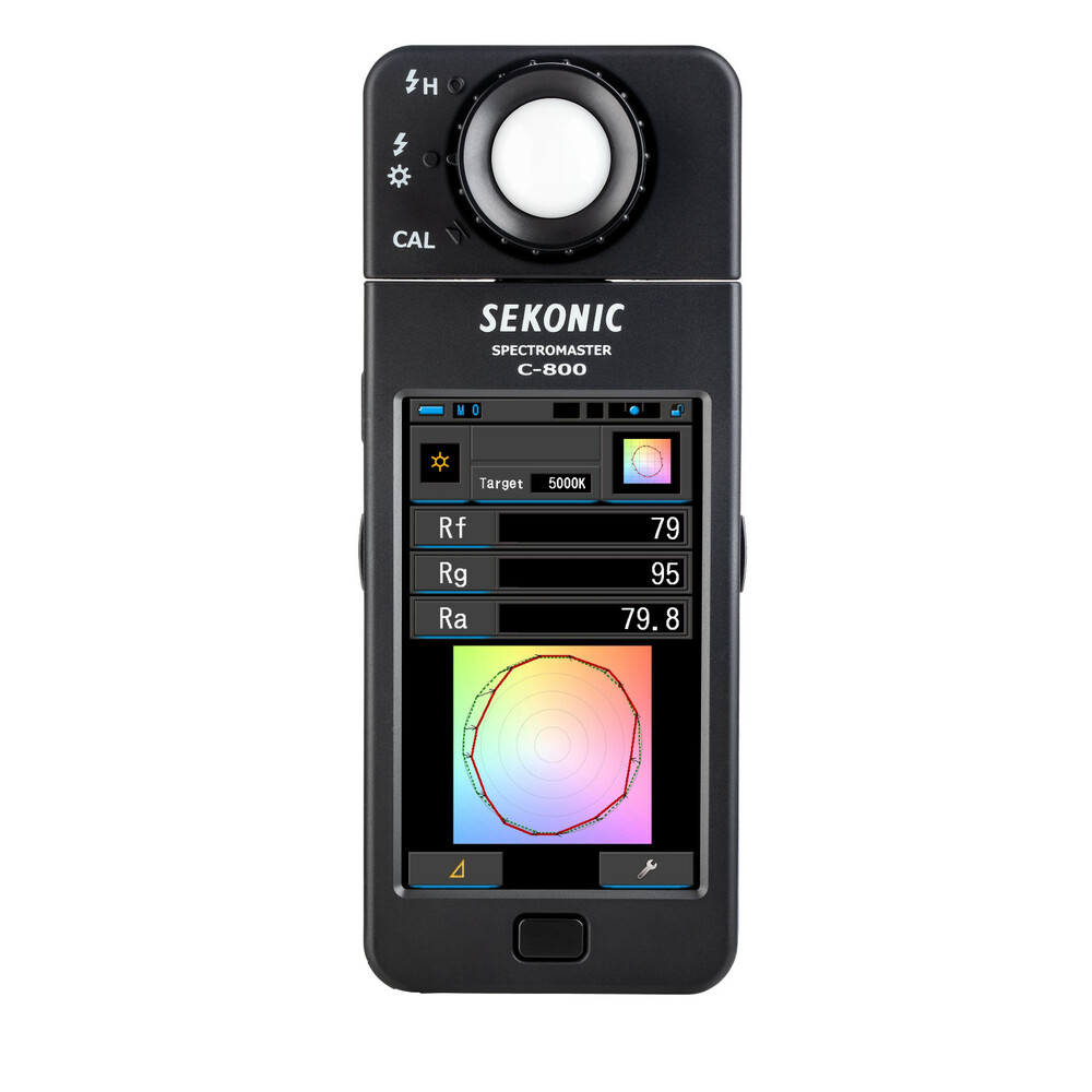 El medidor de color C-800 SpectroMaster de Sekonic es un avanzado medidor de campo diseñado para fotógrafos, cineastas y técnicos de iluminación, capaz de medir prácticamente cualquier fuente de luz, ya sea LED, flash, bombilla incandescente, HMI, fluorescente o el espectro de luz natural. Y lo más importante, es una herramienta práctica para la iluminación que analiza la fuente de luz mediante 11 modos de visualización diferentes en su pantalla táctil a color de 4,3" y muestra concretamente qué hay que hacer para conseguir el efecto deseado. El sensor CMOS del medidor permite realizar mediciones con una precisión de 1 nm y detecta los saltos de color en la salida luminosa, una función especialmente valiosa cuando se trabaja con LED, HMI, iluminación fluorescente y fuentes mixtas.