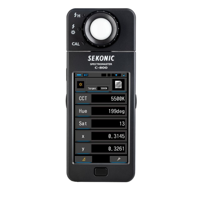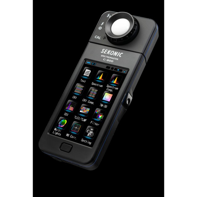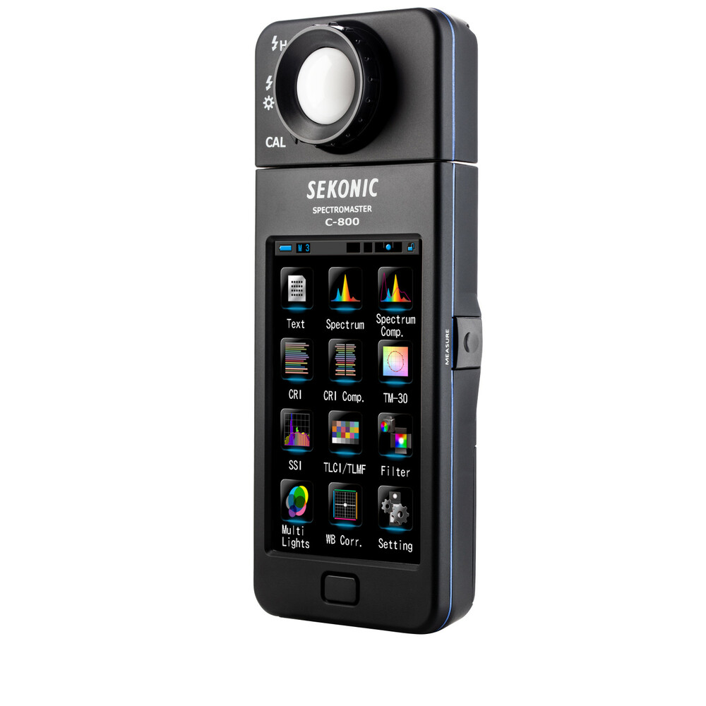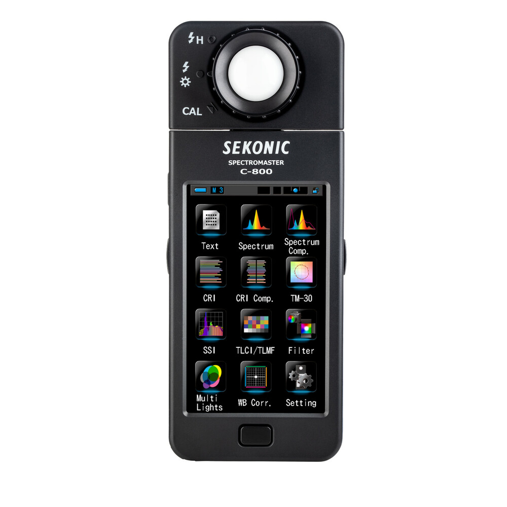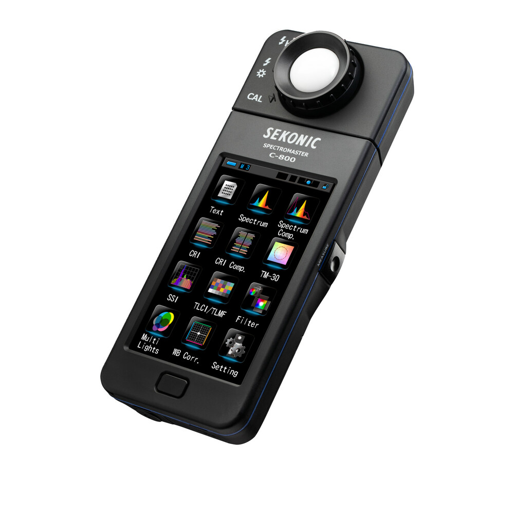 El medidor de color C-800 SpectroMaster de Sekonic es un avanzado medidor de campo diseñado para fotógrafos, cineastas y técnicos de iluminación, capaz de medir prácticamente cualquier fuente de luz, ya sea LED, flash, bombilla incandescente, HMI, fluorescente o el espectro de luz natural. Y lo más importante, es una herramienta práctica para la iluminación que analiza la fuente de luz mediante 11 modos de visualización diferentes en su pantalla táctil a color de 4,3" y muestra concretamente qué hay que hacer para conseguir el efecto deseado. El sensor CMOS del medidor permite realizar mediciones con una precisión de 1 nm y detecta los saltos de color en la salida luminosa, una función especialmente valiosa cuando se trabaja con LED, HMI, iluminación fluorescente y fuentes mixtas.