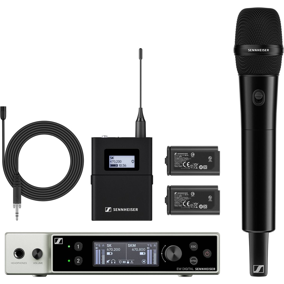 El kit incluye un receptor EW-DX EM 2, un transmisor portátil EW-DX SK con un micrófono de solapa omnidireccional MKE 2, un transmisor de mano EW-DX SKM-S con selector de atenuación y una cápsula dinámica cardioide MMD 835, un soporte para micrófono, una fuente de alimentación, dos baterías BA 70, dos antenas, un kit de montaje GA 3 para rack y cuatro patas…