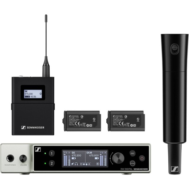 El kit incluye un receptor EW-DX EM 2, un transmisor de petaca EW-DX SK, un transmisor de mano EW-DX SKM-S con selector de atenuación, un soporte para micrófono, una fuente de alimentación, dos baterías BA 70, dos antenas, un kit de montaje GA 3 para rack y cuatro patas de goma.