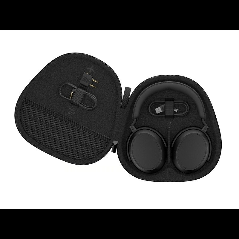 El control y el ajuste del sonido se realizan a través de paneles táctiles intuitivos y una aplicación móvil, donde se puede ajustar el ecualizador, el ANC o guardar perfiles para diferentes entornos. En el paquete encontrarás un elegante estuche, un cable de carga USB-C, un cable de audio de 3,5 mm y un adaptador para avión.