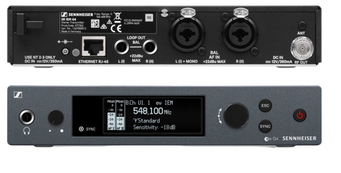 El transmisor SR IEM G4 opera en la banda A (516–558 MHz) y ofrece 1680 frecuencias UHF sintonizables, divididas en 20 grupos de frecuencias con 16 preselecciones de fábrica y un grupo programable por el usuario para una selección precisa de la frecuencia. Esto garantiza una transmisión fiable sin interferencias, incluso en entornos con mucha interferencia de RF.