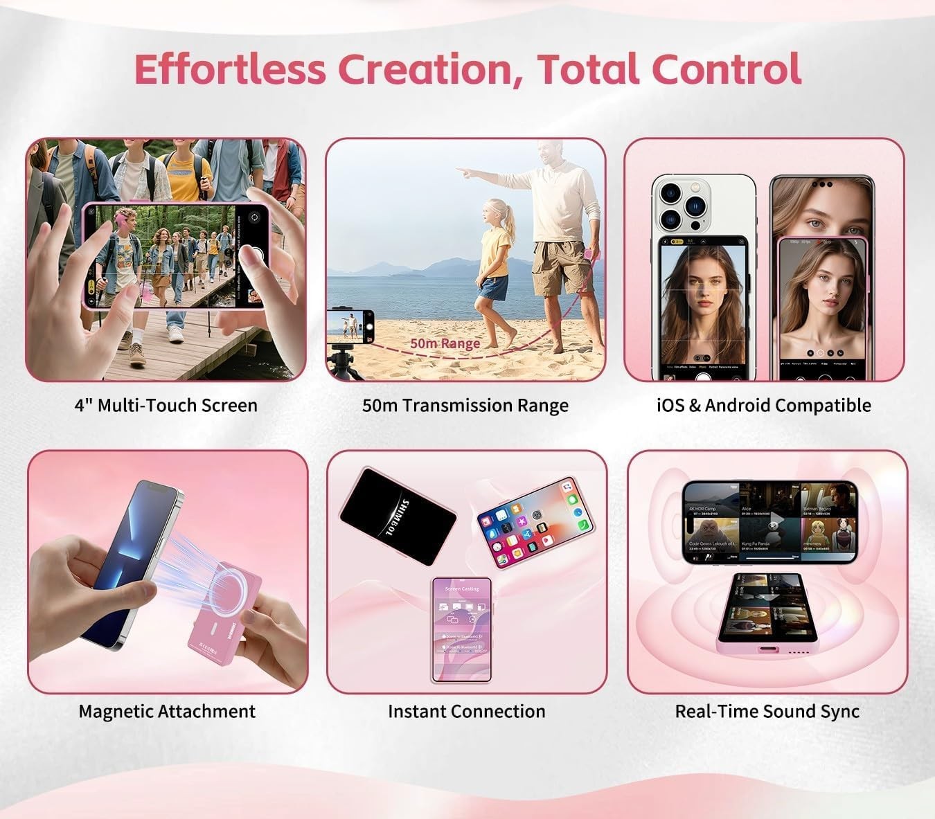 El modelo P4 cuenta con una pantalla multitáctil de 4 pulgadas con una resolución de 640 × 1136 y admite gestos intuitivos, como el zoom con dos dedos, el enfoque con un toque y la navegación deslizando el dedo, lo que permite realizar ajustes precisos antes de tomar la foto. El dispositivo ofrece una experiencia fluida en tiempo real con una latencia extremadamente baja de 0,04 segundos y una conexión Bluetooth 5.0 estable con un alcance inalámbrico de hasta 50 metros.