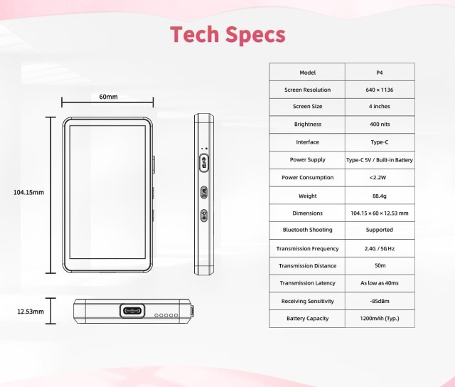 El Shimbol P4 Pink es una pantalla de control inteligente inalámbrica y compacta de 4 pulgadas que te permite controlar tu smartphone a distancia con una latencia prácticamente nula. Gracias a su pantalla multitáctil con una resolución de 640 × 1136, la conexión Bluetooth 5.0 y su amplia compatibilidad con Android/iOS, es ideal para vlogueros, creadores de contenido y grabaciones a distancia.
