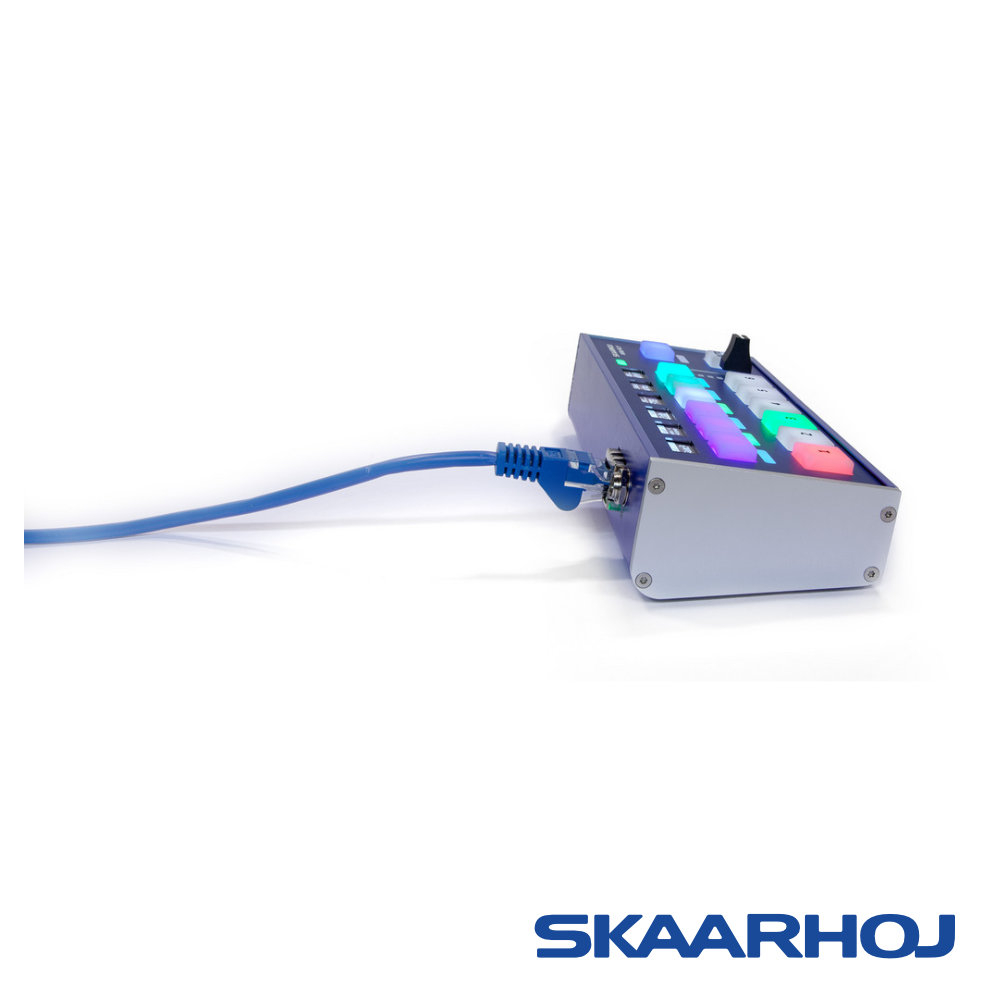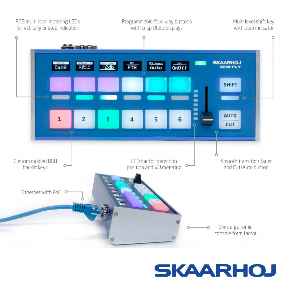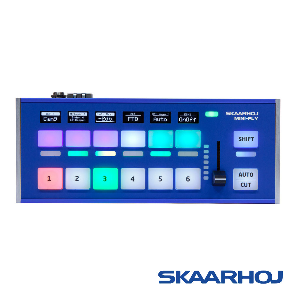 El panel de control compacto y flexible Skaarhoj Mini Fly está diseñado para controlar cómodamente las mesas de mezcla (incluidas Blackmagic Design ATEM, vMix y muchas otras) en producciones más pequeñas de hasta 6 cámaras. A pesar de sus reducidas dimensiones, ofrece una pantalla OLED con etiquetas y botones con retroiluminación RGB, vista previa de los niveles de audio y del estado del fundido, una palanca para controlar los efectos de fundido, una rosca de 1/4"-20 en la parte inferior para un posible montaje fijo, interfaz Ethernet con PoE (IEEE802.3af), etc.