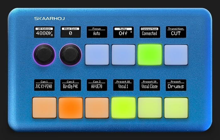 Quick Pad - Blue, que destaca por su elegante diseño y sus 10 botones de cuatro direcciones, además de 2 codificadores retroiluminados, es una obra maestra de personalización e integración. Sus pantallas OLED ofrecen una imagen nítida para las etiquetas de funciones, que se pueden personalizar mediante iconos para un control a medida. Este controlador alimentado por PoE es ideal para salas de reuniones y espacios donde se da importancia a la estética. Se conecta fácilmente al servidor Blue Pill y a otros controladores SKAARHOJ a través del protocolo Raw Panel y ofrece una configurabilidad total con Reactor para una instalación eficaz mediante un único cable.