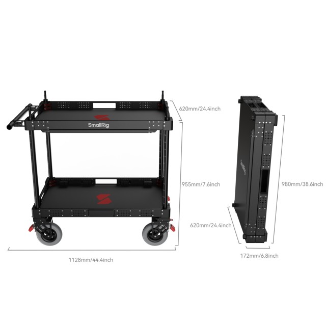 El carro de producción ligero SmallRig de 36" para videocámaras MD4573 es una estación de trabajo móvil profesional diseñada para cineastas y creadores de contenido que necesitan eficiencia, resistencia y versatilidad en el plató, lo que facilita los desplazamientos frecuentes y una rápida puesta en marcha durante el rodaje. El carro está fabricado con aluminio aeronáutico y materiales industriales, y un solo miembro del equipo puede montarlo o desmontarlo en tan solo 5 minutos. Su diseño plegable se reduce a una altura de tan solo 17,2 cm para facilitar su transporte, por lo que es ideal tanto para estudios urbanos como para localizaciones remotas.