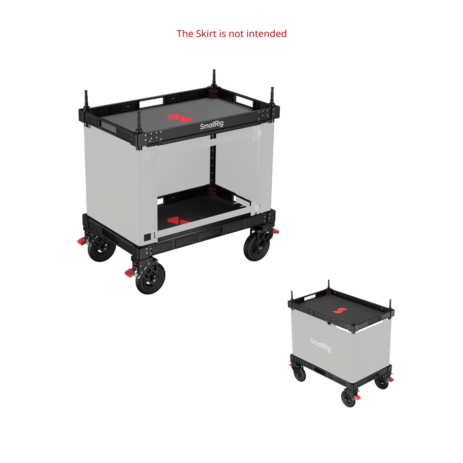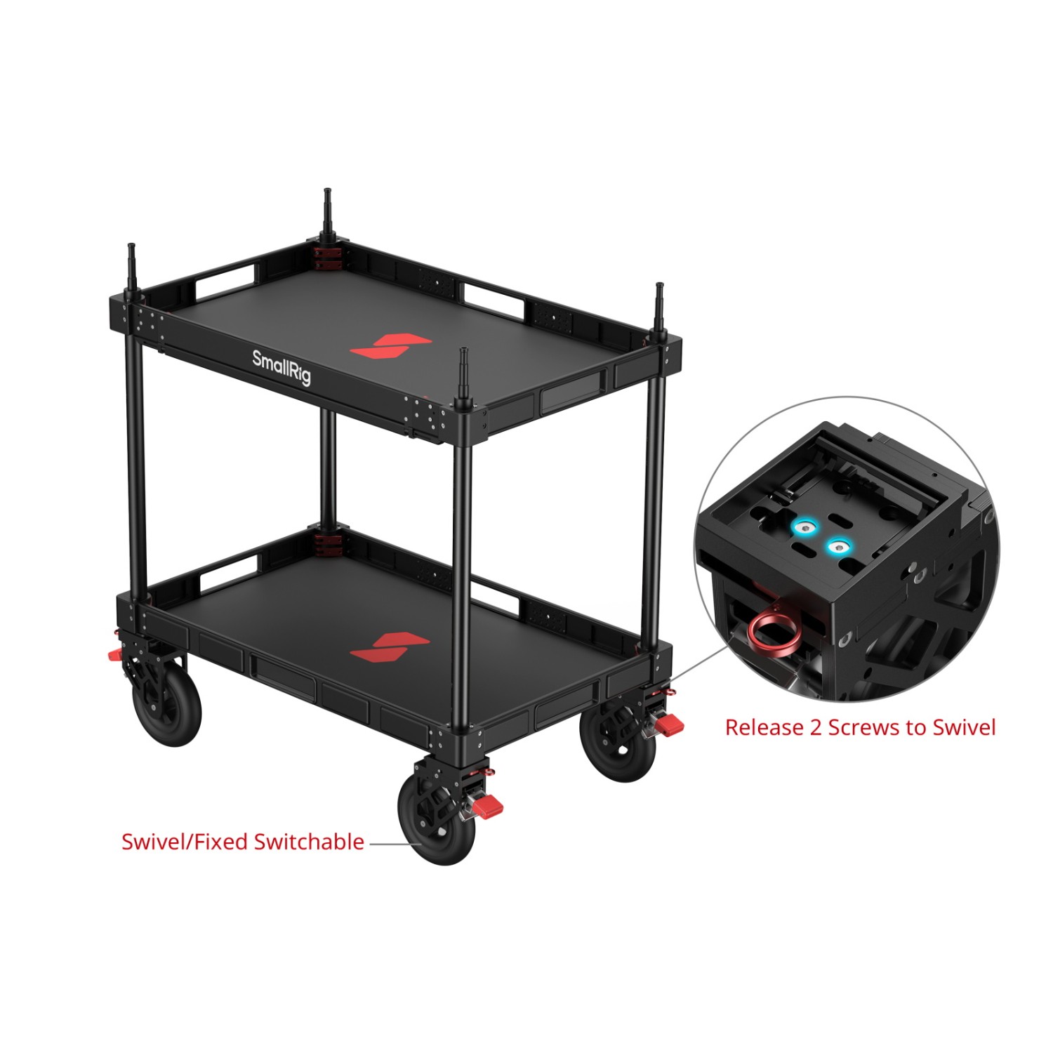 Gracias a la estructura de dos niveles de la plataforma, la parte superior ofrece varios puntos de fijación para conectar monitores, ordenadores portátiles, transmisores inalámbricos y sistemas de alimentación, mientras que la parte inferior aloja de forma segura equipos voluminosos. El carro proporciona una estabilidad excepcional y transporta de forma segura tu equipo durante el desplazamiento.