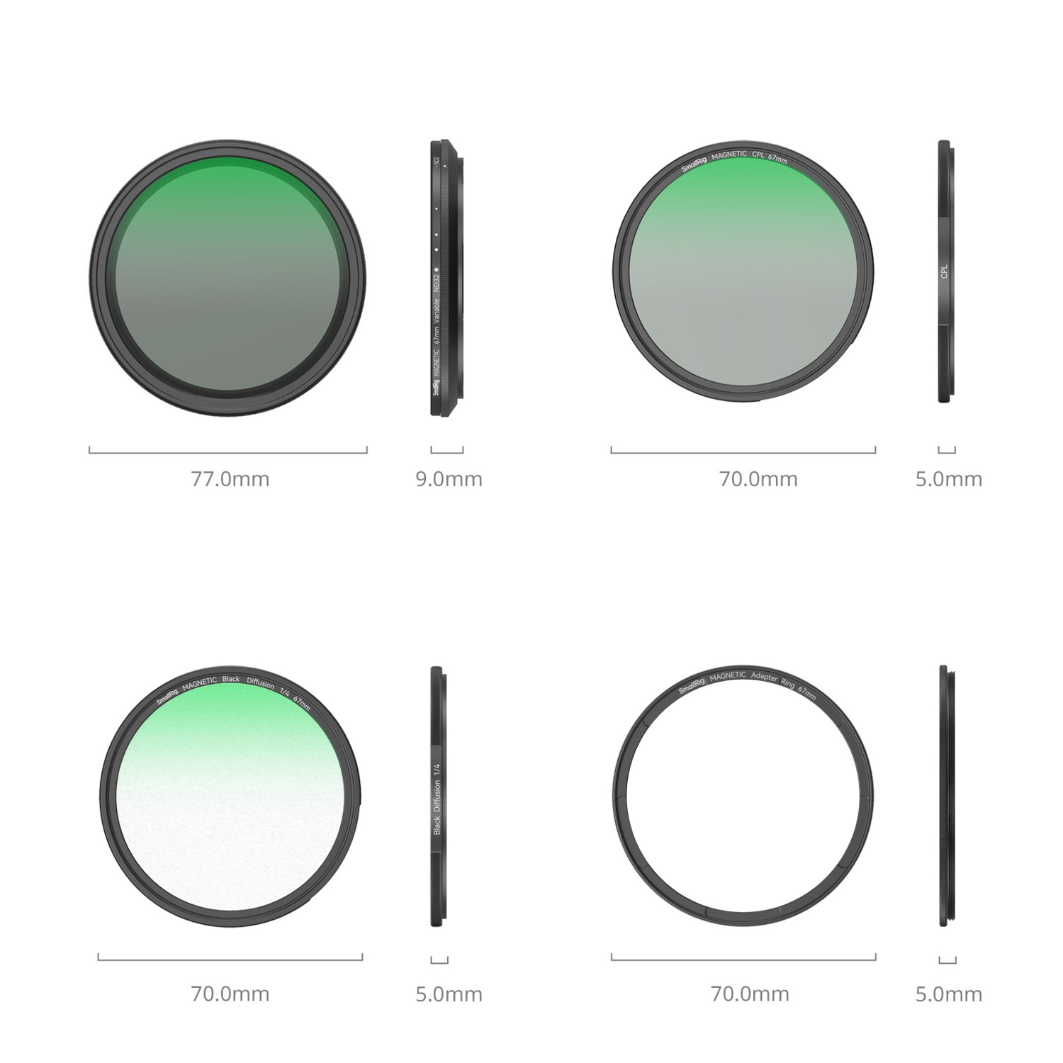 1. El kit incluye los filtros básicos VND, CPL y Black Mist, que se utilizan habitualmente en la grabación de vídeos, además de anillos adaptadores roscados y una tapa magnética para el objetivo. El kit también incluye una funda de almacenamiento gratuita.