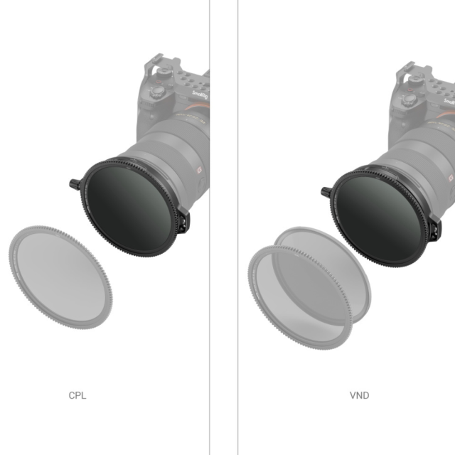 El juego de filtros SmallRig 95 mm CPL-VND con abrazadera de varilla 3864 es un sistema de filtrado especial CPL-VND dos en uno. Los dos filtros CPL se pueden utilizar por separado o conectarse magnéticamente para crear un filtro VND con atenuación continua y ajustable en un rango de 1 a 8 grados. A todo el sistema de filtros se le puede acoplar simultáneamente, mediante un imán, la rosca SmallRig de 95 mm 3645 y el juego de filtros VND 3651, para poder realizar la función de ajuste VND en combinación con la rosca.