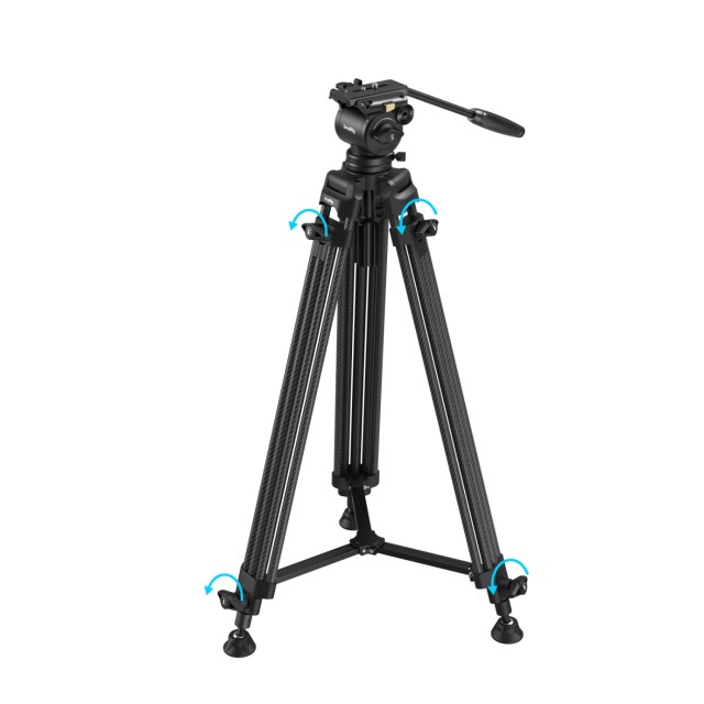 El trípode está fabricado en fibra de carbono y cuenta con patas segmentadas 2-2-1 y patas giratorias integradas con protección contra el aflojamiento, lo que garantiza una estabilidad óptima en terrenos irregulares o pedregosos. A pesar de su construcción robusta, todo el sistema pesa solo 2,7 kg, por lo que es fácil de transportar en entornos de rodaje de ritmo rápido.