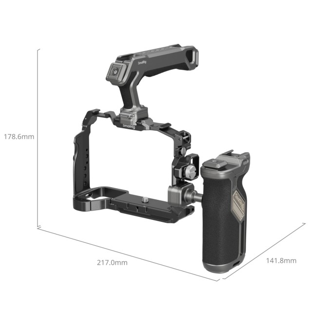 Este kit incluye una jaula, una abrazadera para el cable HDMI, un asa superior y lateral «HawkLock» y una barra NATO «HawkLock».