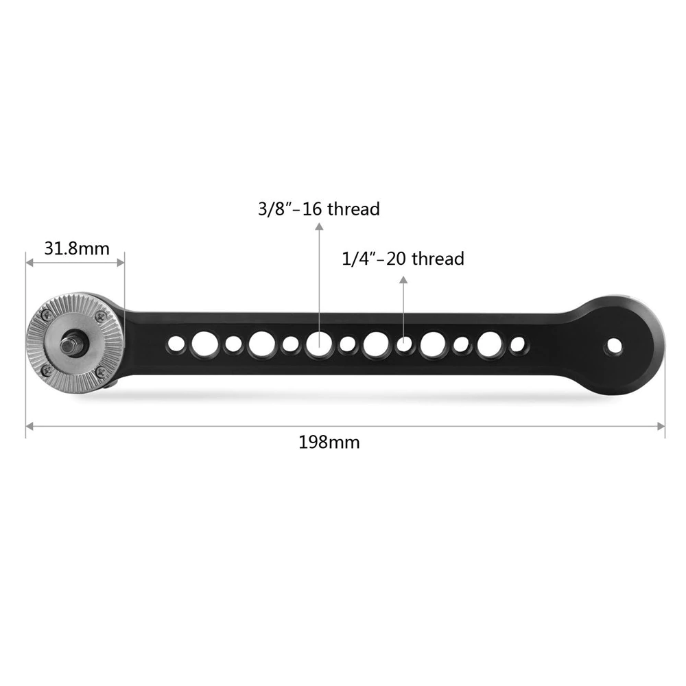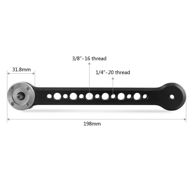 El brazo extensible SmallRig Arri 1807 proporciona una extensión de 198 mm para empuñaduras estándar con roseta Arri y otros dispositivos con soporte de roseta tipo Arri, como RED, URSA Mini, Sony FS7 y otros. En un extremo tiene una rosca exterior M6 y en el otro, una rosca interior M6. El propio brazo cuenta con varios orificios con roscas de 3/8"-16 y 1/4"-20 para fijar accesorios.