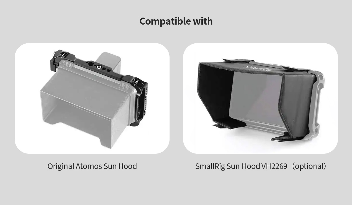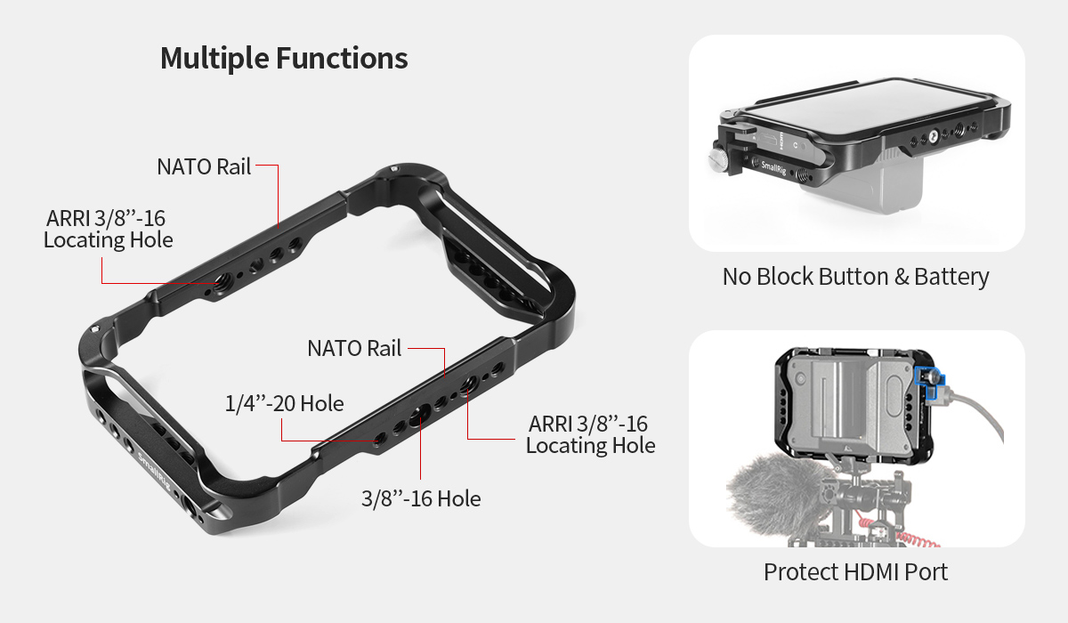 La jaula SmallRig AtomX 5" para Shinobi CMA2305 ha sido diseñada para proporcionar al monitor una estructura protectora adicional con una amplia gama de puntos de fijación estándar. La jaula se fija al monitor mediante dos tornillos de 1/4"-20 en la parte superior e inferior. La jaula cuenta con varios orificios de 1/4"-20 y 3/8"-16 en todos los laterales y en la parte trasera del monitor, lo que permite una máxima flexibilidad de montaje. En todos los laterales hay puntos de fijación ARRI y, tanto en la parte superior como en la inferior, también hay rieles NATO disponibles, lo que permite su uso con toda una gama de soportes SmallRig. La jaula incluye una abrazadera para el cable HDMI, compatible con cables Atomos y otros, que protege tanto el cable como el puerto. En la parte superior e inferior de la jaula hay puntos de fijación elevados para usar con correas de cuello y para acoplar el marco Atomos Ninja V Sunhood.
