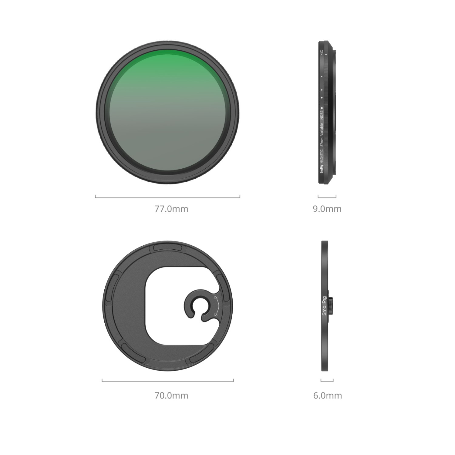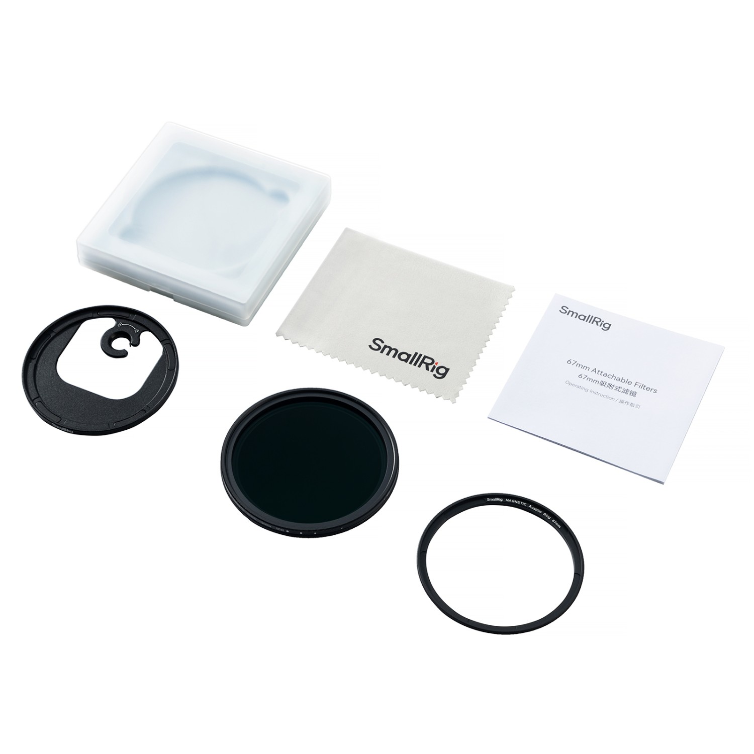 Juego de filtros VND SmallRig ND2-ND32 (1-5 pasos) con adaptador para filtros M-mount de 67 mm 4724 Gracias al filtro VND con reducción de exposición ajustable, los usuarios pueden utilizarlo de forma flexible durante la grabación de vídeo, lo que les permite ajustar los parámetros de exposición de forma razonable y obtener grabaciones de vídeo más profesionales. El cristal óptico multicapa ofrece una calidad óptica fiable y garantiza que las imágenes capturadas no presenten viñeteado. El sistema de fijación magnético permite a los usuarios instalar y cambiar los filtros de forma rápida y eficaz. El kit incluye un anillo adaptador M-mount para la integración directa con la placa trasera M-mount de las carcasas de la serie iPhone. El filtro, equipado con un anillo adaptador roscado, se puede acoplar a un objetivo de cámara de 67 mm de diámetro, lo que permite una cómoda instalación magnética de los filtros en los objetivos de la cámara.