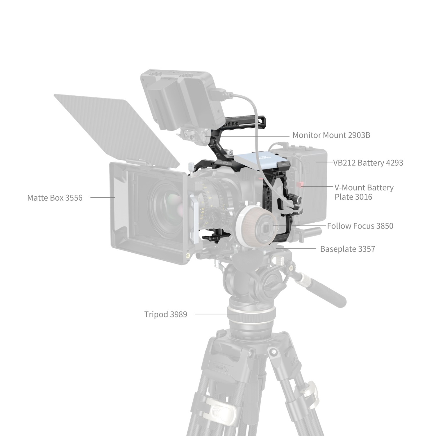 El kit SmallRig Basic Cage para la cámara Blackmagic Design Cinema Camera 6K 4574 está diseñado para ofrecer a los creadores una cómoda filmación desde ángulos bajos, proteger la cámara y proporcionar una amplia gama de opciones de ampliación con accesorios. El kit incluye una jaula, un asa superior, una abrazadera para cables HDMI y USB-C, un soporte para fijar un SSD y un soporte para el adaptador de objetivo. El sistema de fijación de tres puntos sujeta la cámara mediante dos tornillos de 1/4"-20 en la base y un tornillo de 1/4"-20 en la parte superior, mientras que las almohadillas de silicona integradas evitan que se raye. La jaula permite acceder libremente a todas las interfaces de la cámara, las ranuras para tarjetas, la pantalla abatible y el compartimento de la batería.