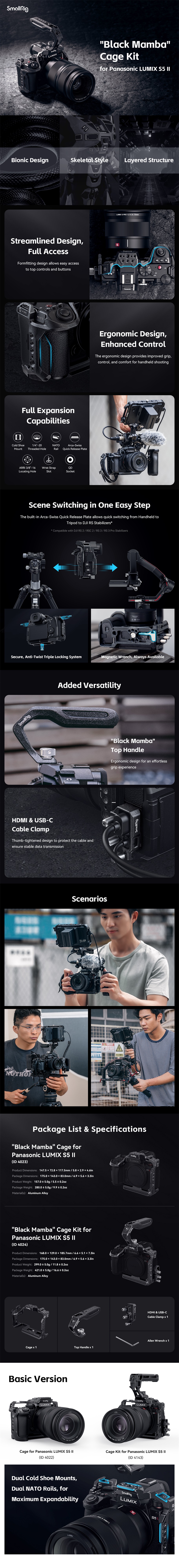 La jaula SmallRig «Black Mamba» para Panasonic LUMIX S5 II / S5 IIX 4023 está diseñada para proteger la cámara y fijar los accesorios. Fija la cámara mediante un tornillo inferior de 1/4"-20 y dos adaptadores de bloqueo laterales, con almohadillas de goma que evitan los arañazos, y en su conjunto presenta el diseño «Black Mamba», que permite un acceso completo a todos los controles superiores. Entre los puntos de fijación de accesorios se incluyen orificios de 1/4"-20 para la empuñadura lateral 2093B; el orificio de posicionamiento delantero de 1/4"-20 es adecuado para la abrazadera de varilla 3276 para el sistema de enfoque posterior; y el orificio de posicionamiento ARRI de 3/8"-16 es adecuado para la empuñadura superior 3786 o el soporte para monitor 2903B. También se suministra con una barra NATO izquierda para el mango lateral 3847; con soportes para zapata fría para conectar un micrófono o una luz LED de vídeo, y con un encaje QD inferior para instalar una correa de hombro QD. En la parte inferior se encuentra una placa de fijación rápida Arca-Swiss, compatible con los gimbals DJI RS 2 / RSC 2 / RS 3 / RS 3 Pro y los trípodes Arca-Swiss, así como un orificio roscado para la placa de fijación rápida (riser pad) DJI RS 2 / RSC 2 y la placa de fijación rápida Arca-Type 3154. El artículo también cuenta con orificios para correas a ambos lados y en la parte inferior, compatibles con la correa de mano 3848, la correa de hombro PSC2428, etc. Además, el paquete incluye una llave magnética para facilitar el desmontaje y el montaje.