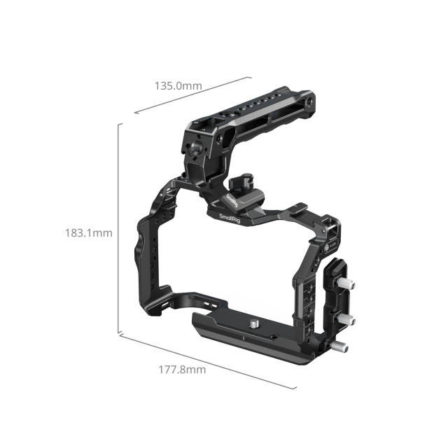 El kit incluye una empuñadura superior que se fija de forma segura a la jaula, con dos soportes para zapata fría y otros orificios roscados de 1/4"-20 y 3/8"-16 para accesorios. Esto te permite fijar de forma rápida y eficaz micrófonos, luces, monitores u otro equipo. La abrazadera para cables HDMI garantiza que tus cables permanezcan bien sujetos en su sitio y evita que se desconecten accidentalmente, algo imprescindible durante la fotografía en movimiento.