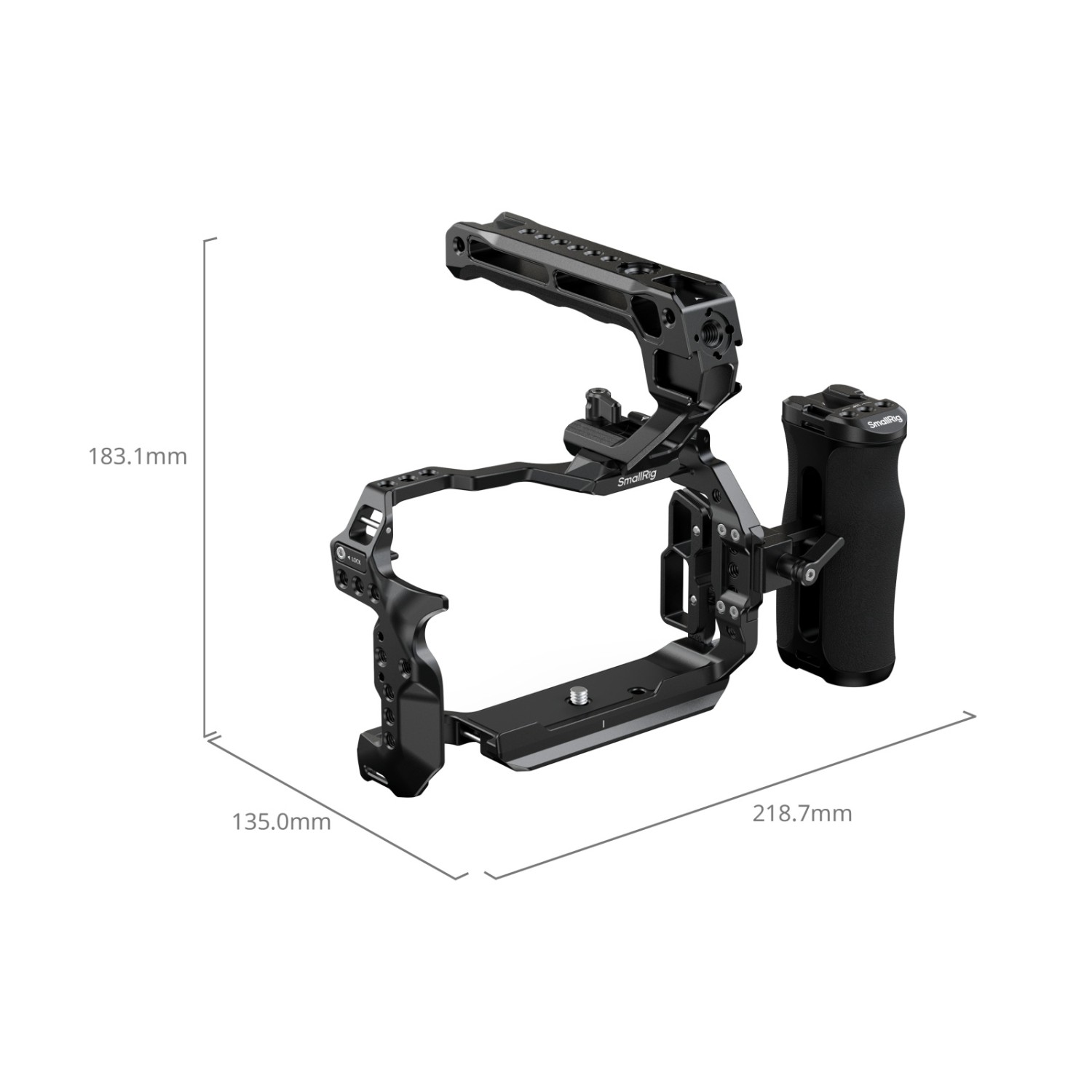 La empuñadura superior ofrece opciones de fijación adicionales gracias a 3 soportes para pies fríos y varias roscas para fijar micrófonos, luces, monitores u otros dispositivos. La empuñadura lateral está diseñada ergonómicamente para mayor comodidad, con un agarre ajustable hacia arriba y hacia abajo y un orificio roscado de 1/4"-20 para una mayor flexibilidad de fijación.
