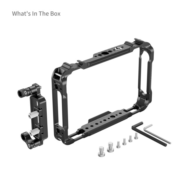 La jaula está equipada con un sistema de deslizamiento integrado para conectar rápidamente accesorios como los brazos mágicos (ID 2071B) y los soportes para monitores (ID BSE2385). También cuenta con orificios roscados de 1/4"-20 para fijar soportes de monitor (ID 2903B) y brazos mágicos (ID 2070 B), junto con orificios de fijación ARRI para brazos mágicos (ID 2115C). La zapata fría integrada es compatible con micrófonos inalámbricos, transmisores y otros dispositivos. Además, cuenta con orificios en la parte superior e inferior para fijar una correa de hombro. El kit incluye una abrazadera especial para el cable HDMI, equipada con un diseño antidesconexión de SSD para evitar la desconexión accidental de los discos SSD grandes de Atomos, garantizando así una conexión segura y una transmisión de señal estable.