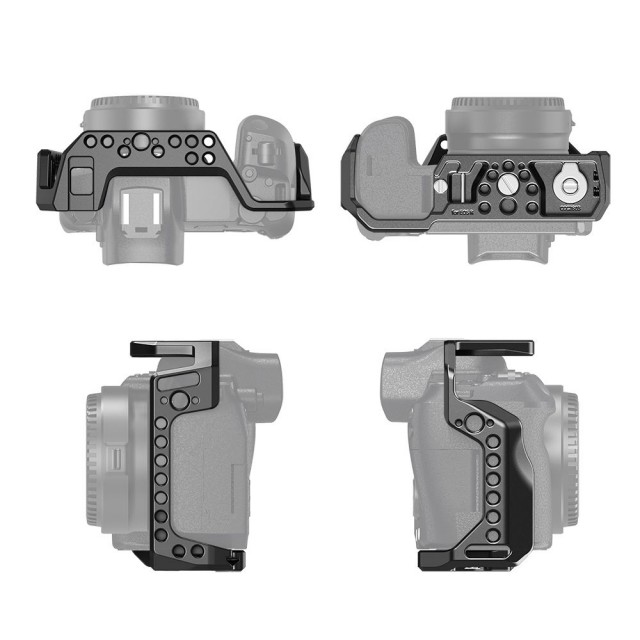 Es una carcasa rígida que se ajusta perfectamente al contorno de la cámara, diseñada para ofrecer protección y puntos de fijación para los accesorios de tu cámara. La jaula se fija a la parte inferior de la cámara mediante un tornillo de 1/4"-20 y está equipada con dos pasadores antirrotación. Cuenta con varios orificios roscados de 1/4"-20 y 3/8"-16, roscas para accesorios ARRI y una zapata fría que permite el montaje de accesorios. Por ejemplo, puedes acoplar la empuñadura superior SmallRig 2165 o la empuñadura lateral de madera SmallRig 2093 para grabar a mano alzada; acoplar el brazo SmallRig Ball Head Magic Arm 2070 o el soporte para monitor SmallRig 1842 para conectar un monitor. Es compatible con la abrazadera para cables SmallRig 1822, que protege el cable HDMI y el puerto. Si utilizas un adaptador para montar un objetivo Canon EF-EOS R, puedes usar el SmallRig BSA2696 para reforzar la fijación y aliviar la presión del objetivo pesado. Además, la jaula está equipada con una placa Arca Swiss QR integrada y un destornillador plano en la parte inferior.