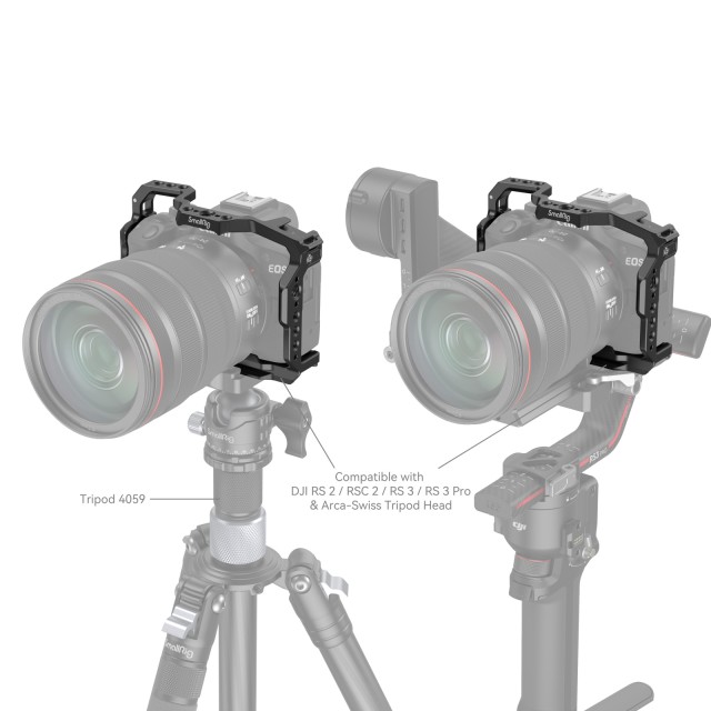 La jaula SmallRig para la Canon EOS R50 4214 está diseñada para proteger la cámara y fijar los accesorios. La jaula se fija mediante un tornillo inferior de 1/4"-20 y dos adaptadores de bloqueo laterales, está equipada con almohadillas de goma que evitan los arañazos y permite un acceso completo a los botones, las ranuras para tarjetas, la pantalla abatible y el compartimento de la batería. Entre sus puntos de fijación para accesorios se encuentran orificios roscados de 1/4"-20, orificios roscados de 3/8"-16 y orificios de posicionamiento ARRI de 3/8"-16, que admiten la empuñadura superior 3765, la empuñadura lateral 2093C, el soporte para monitor 2903B y el brazo Magic Arm 3875;