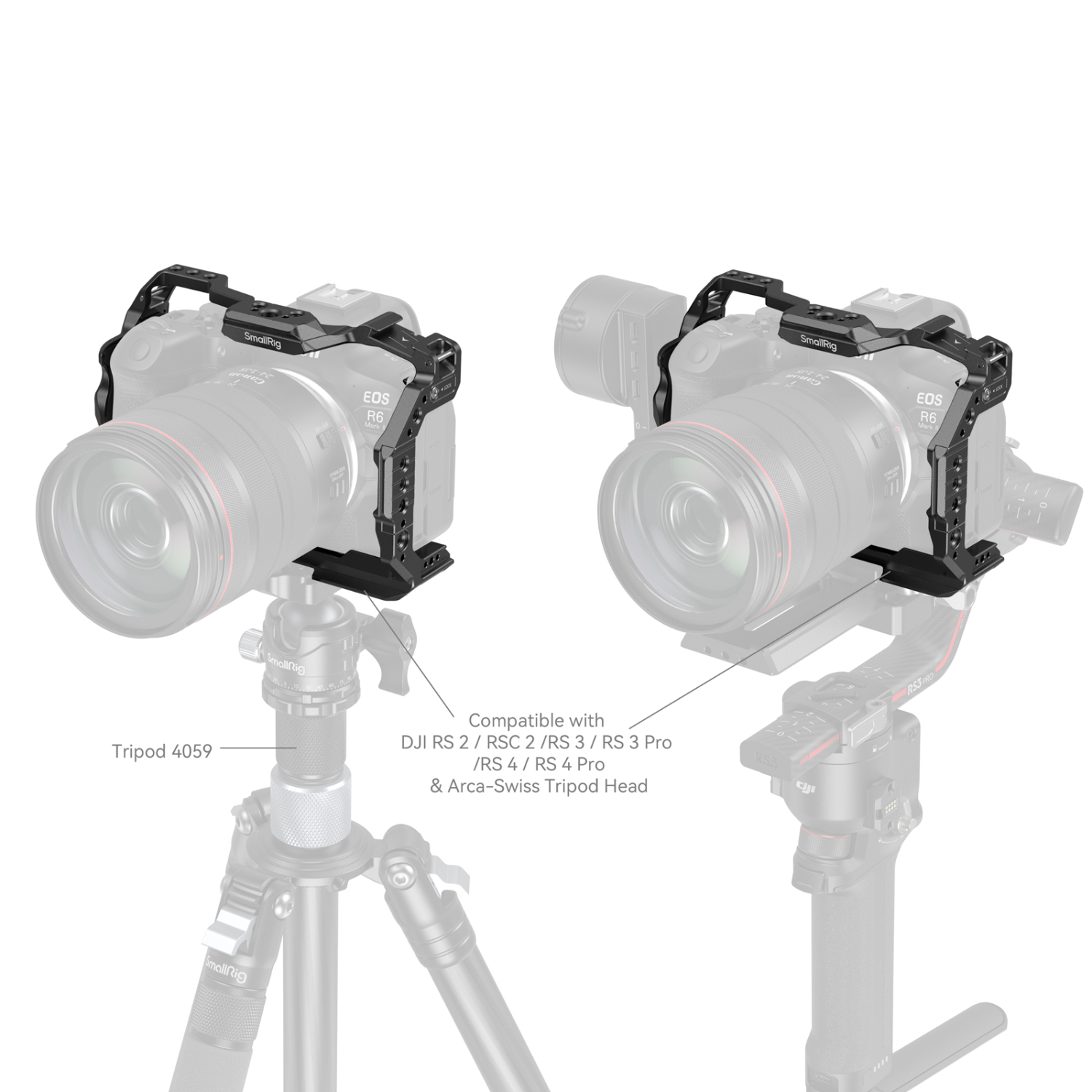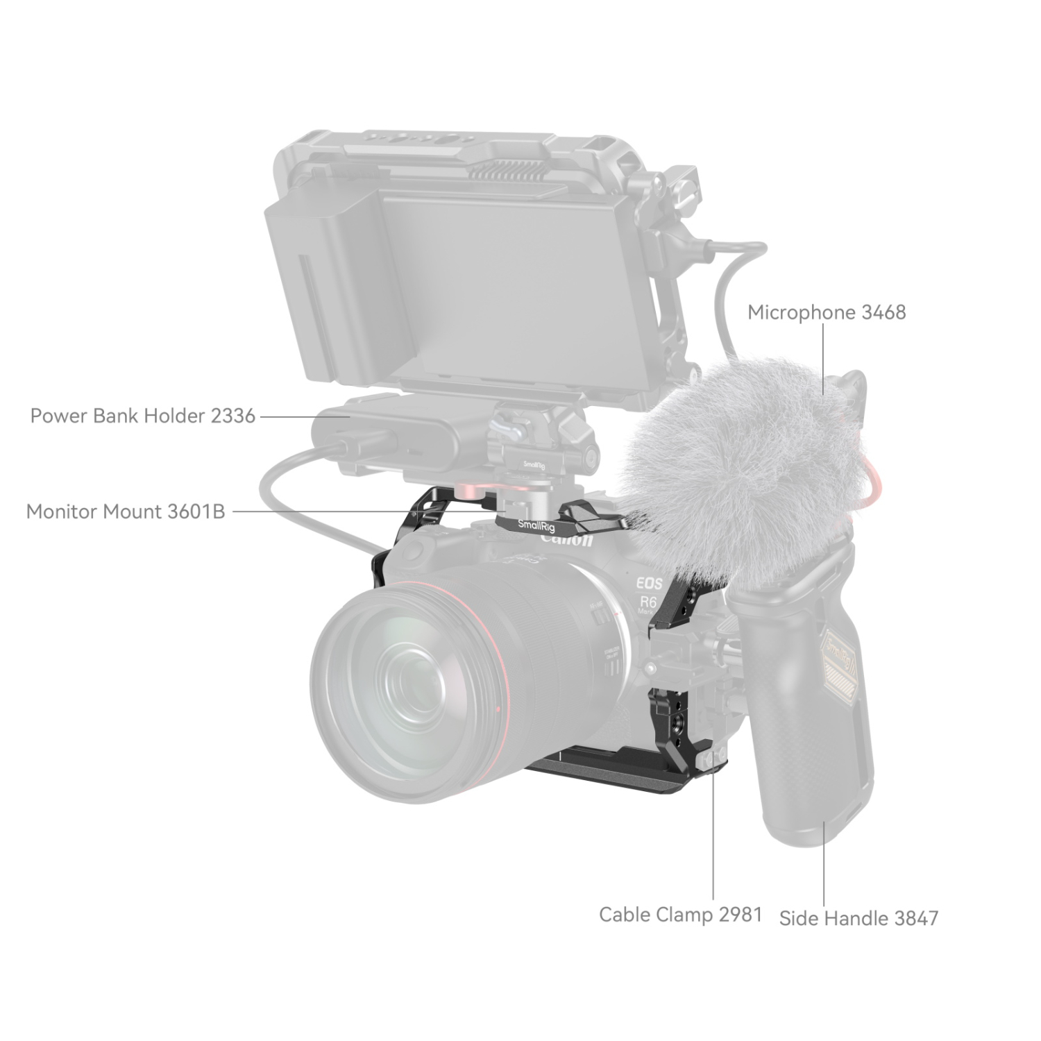La jaula de fijación rápida SmallRig HawkLock para Canon EOS R6 Mark II 4159B está diseñada para proteger y fijar los accesorios. Sujeta la cámara mediante un tornillo de 1/4"-20 en la parte inferior y un adaptador de bloqueo lateral a cada lado, mientras que las almohadillas de goma evitan que se raye. La jaula permite acceder al botón de la cámara, al compartimento de la tarjeta, a la pantalla y al compartimento de la batería, y está equipada con varios puntos de fijación para accesorios. Entre ellos se incluyen, entre otros, un orificio roscado de 1/4"-20, un orificio roscado de 3/8"-16 y un orificio de posicionamiento ARRI de 3/8"-16, que admite las empuñaduras laterales 2093 y 3814, la empuñadura superior 3765, los soportes para monitor 2903 y 2904, las placas inferiores Manfrotto 1280 y 2458, el soporte para baterías externas portátiles 2336 y la placa V Mount Battery Plate 2987. Los orificios de fijación de 1/4"-20 a ambos lados son compatibles con las abrazaderas Single Rod Clamp 3598 y Magic Arm 3873, y los dos orificios roscados de 1/4"-20 en dirección horizontal en el lado derecho garantizan una captura vertical estable.