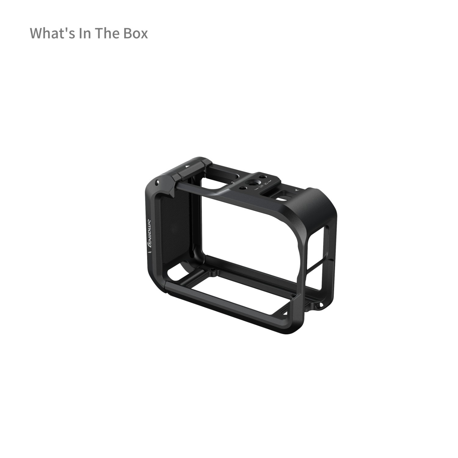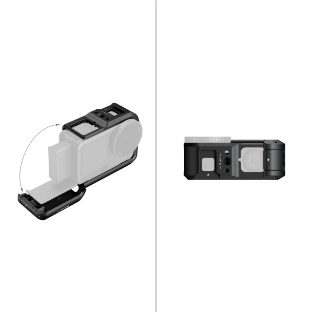 La jaula está equipada con un soporte para fijar luces o accesorios de audio, como el DJI Mic 2 o la SmallRig Video Light (ID 5446). Además, cuenta con soportes magnéticos de liberación rápida en el lateral, compatibles con el adaptador original DJI Dual-Direction Quick-Release Adapter Mount. La base abierta permite el acceso directo al soporte magnético de liberación rápida de la cámara, lo que, en combinación con los soportes de liberación rápida SmallRig Dual-Mount Quick Release Supports (5890, 5779, 5991), permite cambiar rápidamente entre la grabación horizontal y vertical.