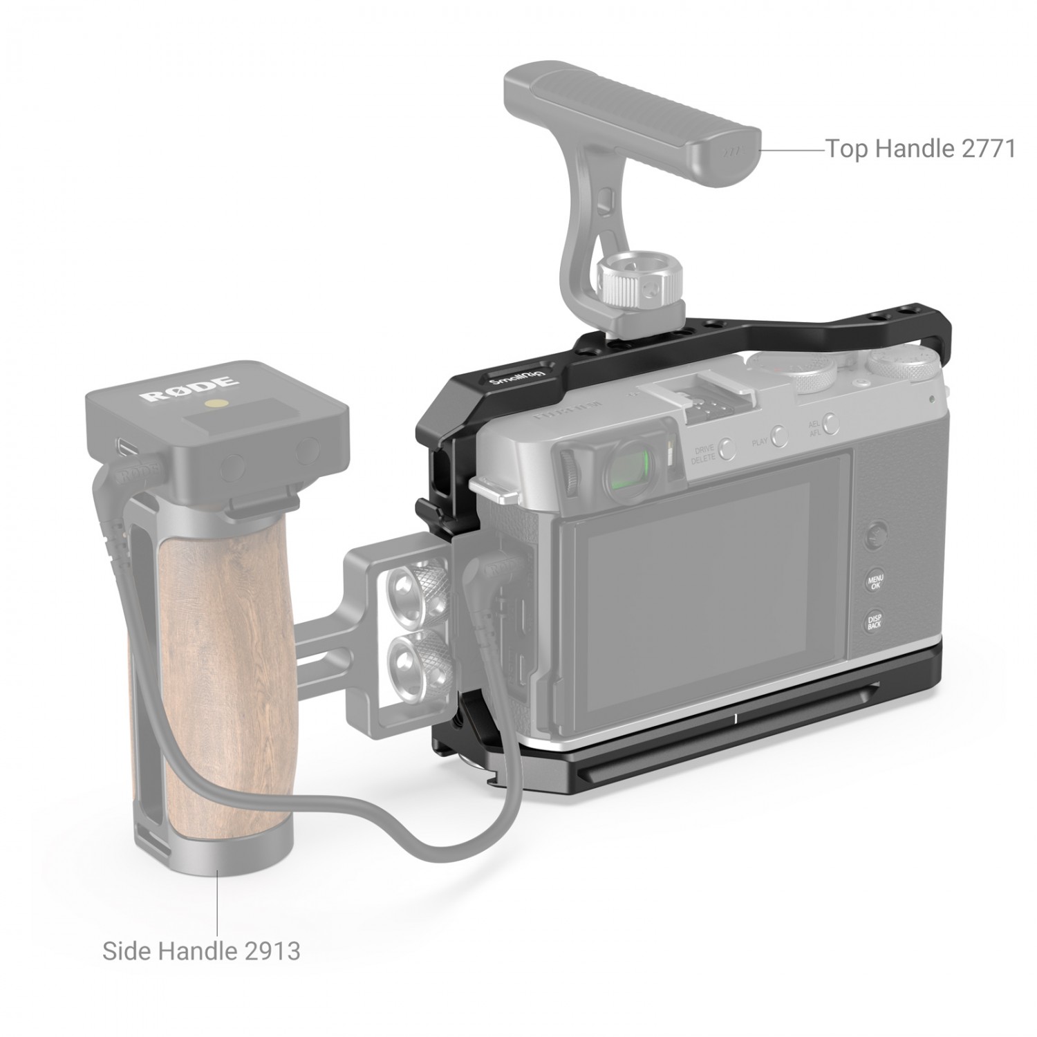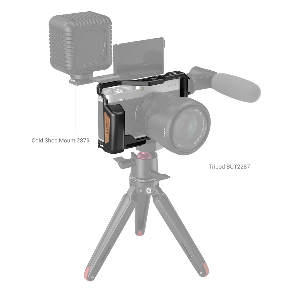 La jaula SmallRig para la cámara Fujifilm X-E4 3230 está diseñada para proporcionar puntos de montaje para accesorios y mejorar la experiencia de sujeción durante la grabación profesional de vídeo. Se fija a la cámara mediante un único tornillo de 1/4"-20 en la parte inferior y cuenta con bridas antitorsión en la parte delantera. Está equipada con varios orificios roscados de 1/4"-20 integrados para la empuñadura superior SmallRig HTS2756, el soporte para monitor 2904, el soporte Cold Shoe 2879, etc. Su orificio de posicionamiento superior ARRI de 3/8"-16 es adecuado para la empuñadura superior ARRI 2165 y el soporte para monitor 2903; la ranura integrada a la izquierda permite montar un micrófono o una luz LED.