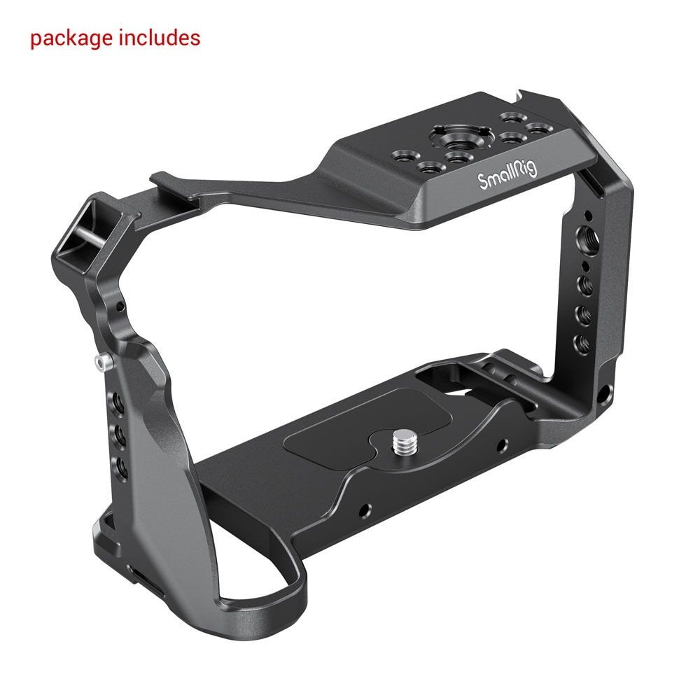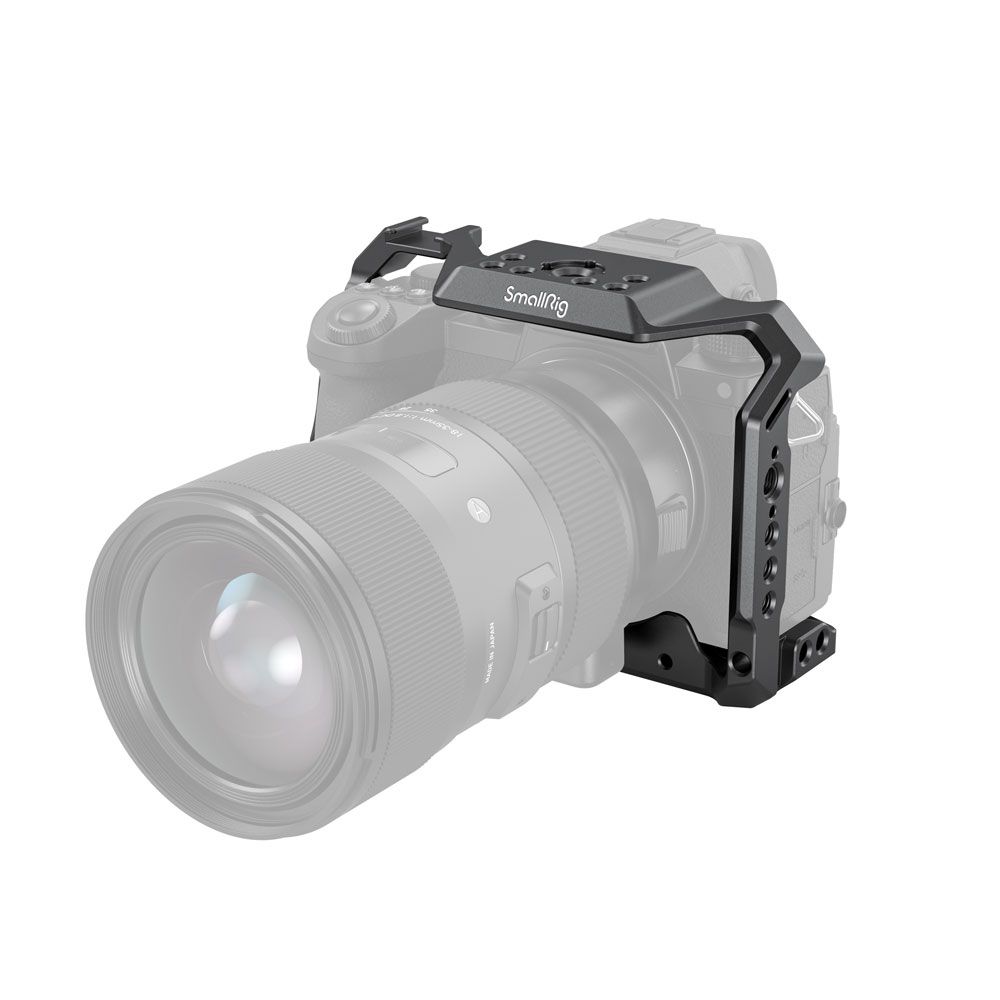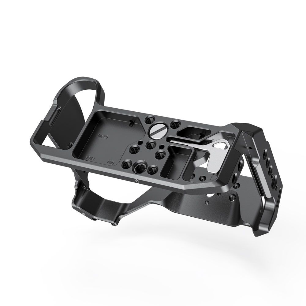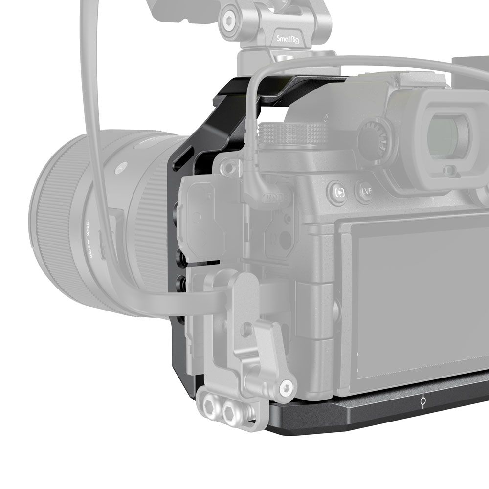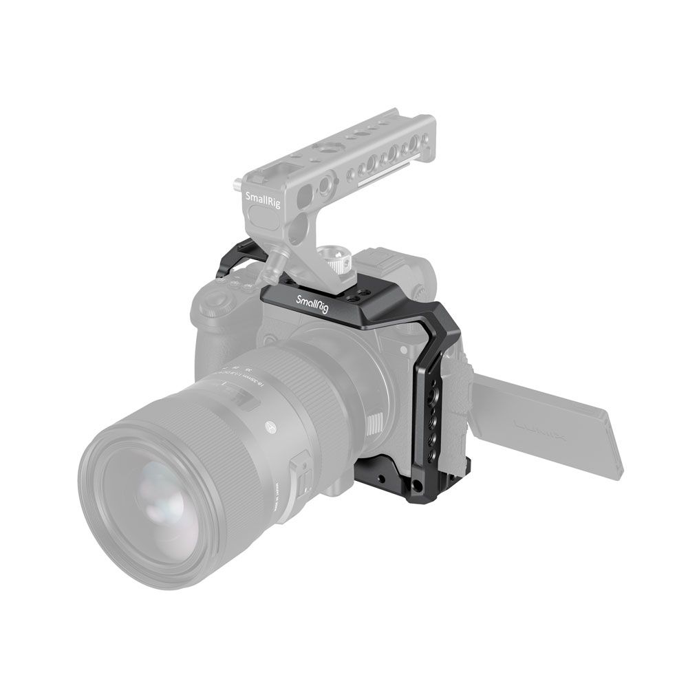 La jaula SmallRig para la cámara Panasonic S5 2983 es una jaula integral con un diseño adaptado, pensada para proteger la cámara y fijar los accesorios. La jaula se fija a la cámara mediante un tornillo de 1/4"-20 en la parte inferior y un tornillo M2,5 en el lado derecho para mayor seguridad, con el fin de evitar que se tuerza. Está equipada con varias roscas de 1/4"-20 y ARRI 3/8"-16 para accesorios, como el asa superior 2165 y el soporte para monitor 2903. La jaula se integra con una zapata fría en la parte superior para micrófono y luz, y en el lado izquierdo se suministra con una barra NATO para el NATO Handle 2187 y el Magic Arm 2071.