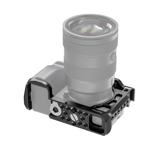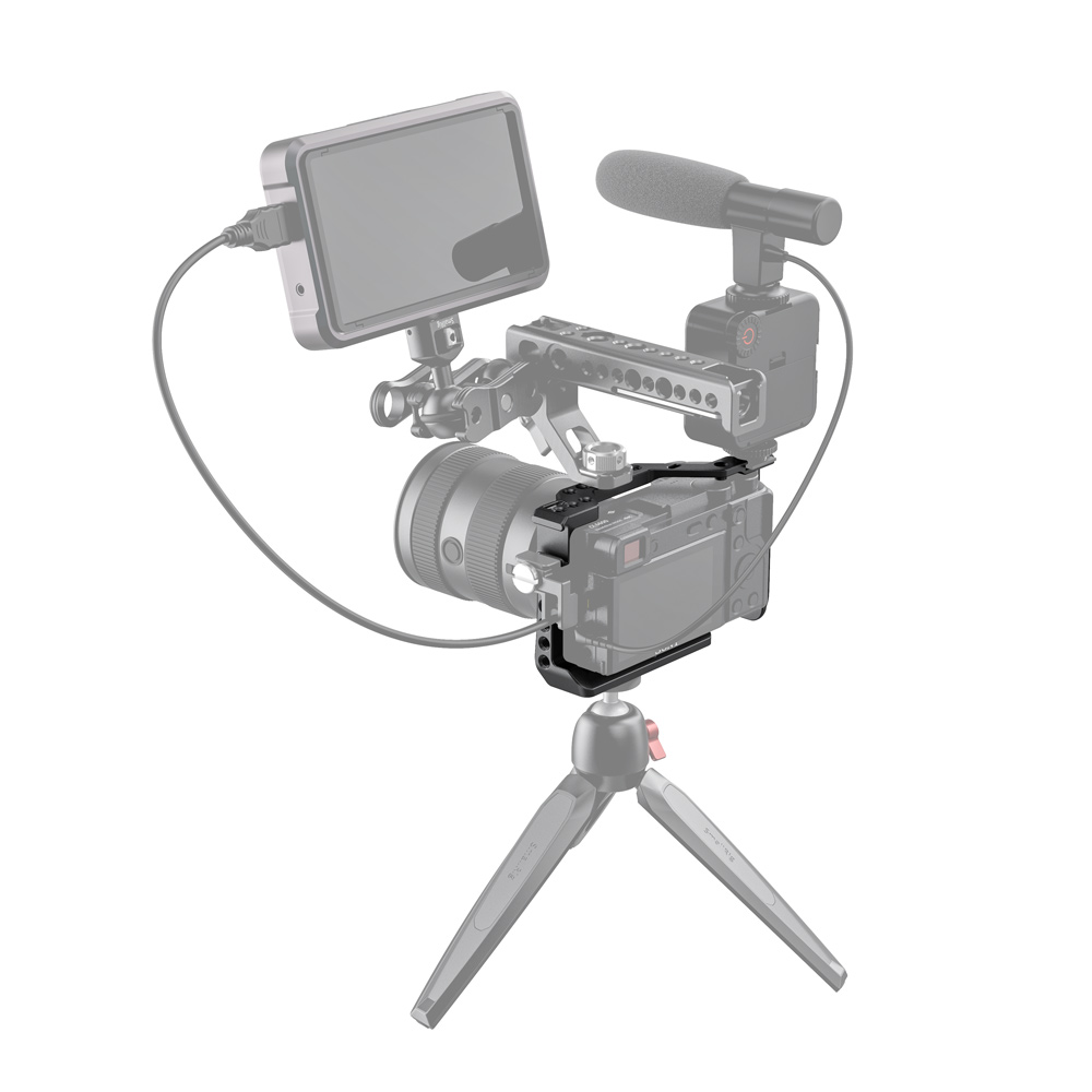 La jaula SmallRig para Sony A6600 CCS2493 está diseñada para ofrecer protección y roscas de montaje para accesorios como monitores, micrófonos, luces y empuñaduras. La jaula se fija a la parte inferior de la cámara mediante un tornillo inferior de 1/4"-20 y un tornillo M2,5 para evitar que se tuerza. Está equipada con varios orificios para accesorios de 1/4"-20, 3/8"-16 y Arri 3/8"-16, que permiten montar la empuñadura superior 2165, el soporte para monitor 2294 y el soporte para monitor 2348.