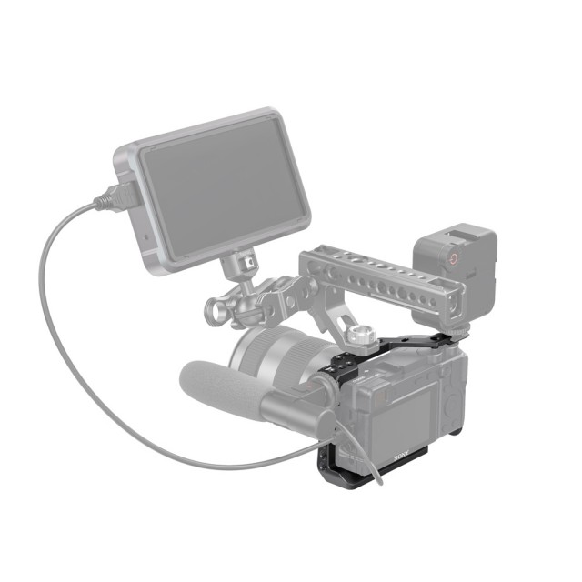 Incorpora dos soportes de zapata fría, uno en la parte superior y otro a la izquierda, para micrófono y luz. Además, la jaula cuenta con orificios a ambos lados para la correa de transporte. La parte inferior se suministra con un destornillador plano para una instalación rápida. La abrazadera opcional para cable HDMI 1693 y el soporte para adaptador de objetivo 1787 se venden por separado si son necesarios.