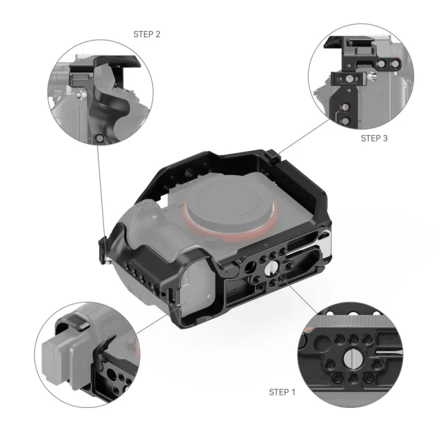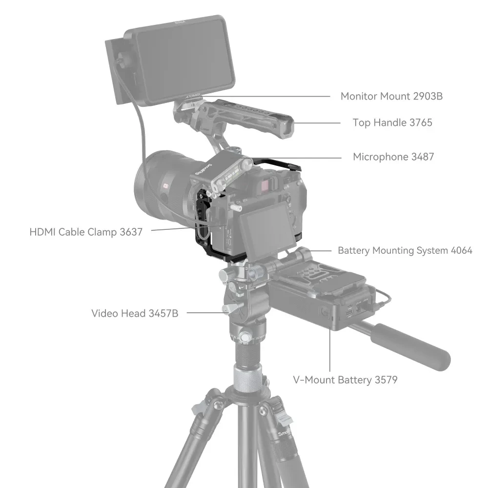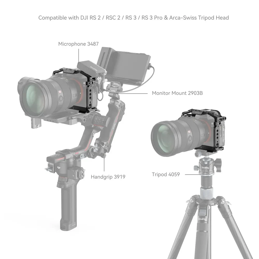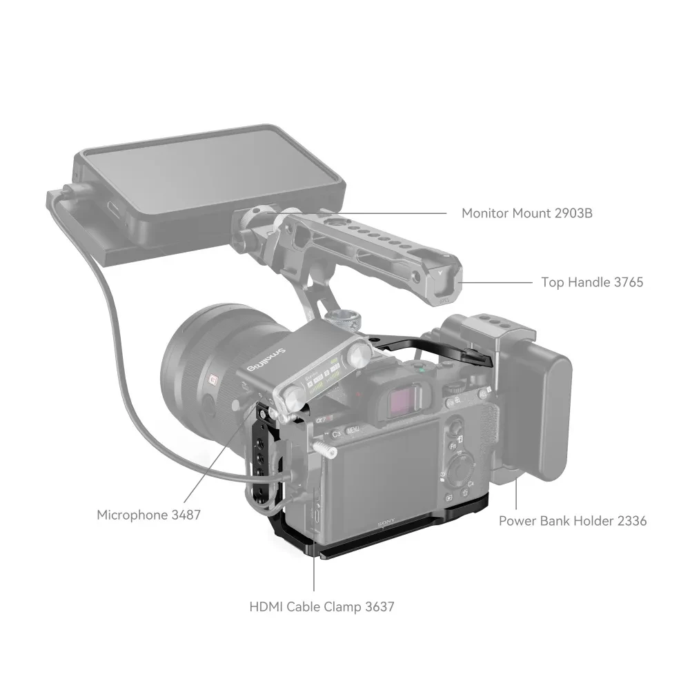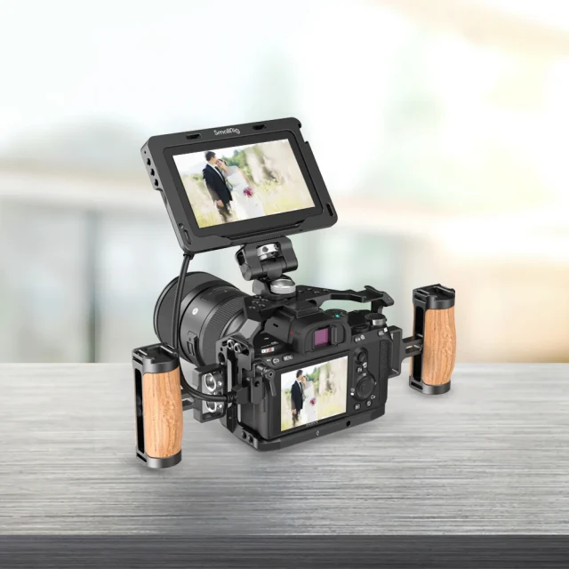 La jaula SmallRig A7RIII 2087 está diseñada exclusivamente para las Sony A7RIII/A7M3/A7III. Ofrece numerosas opciones de fijación adicionales y permite aprovechar al máximo el potencial de la cámara según las necesidades de los operadores durante el rodaje. Está equipada con una zapata fría en la parte superior derecha. Se le puede acoplar un micrófono, un brazo Magic Arm1497/1498/2070 y, posteriormente, un monitor. Los puntos de fijación Arri de la parte superior son compatibles con los pasadores de fijación Arri, al igual que el brazo Magic Arm con el adaptador antirrotación Magic Arm 2026 para el monitor o el transmisor de imagen inalámbrico.