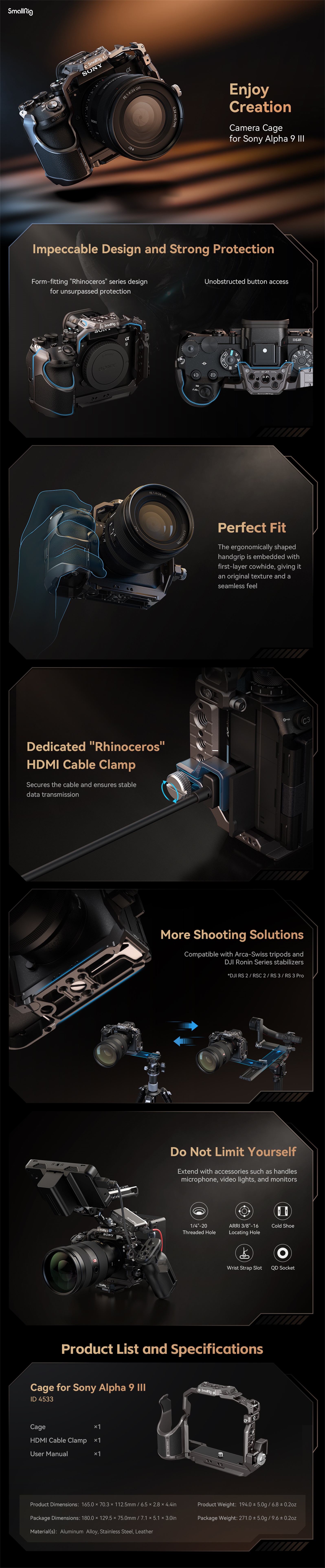 La jaula SmallRig para Sony Alpha 9 III 4533 está diseñada para proteger la cámara y permitir la ampliación con accesorios. El sistema de fijación de tres puntos contra el desplazamiento sujeta firmemente la Alpha 9 III mediante pasadores de posicionamiento, un tornillo de 1/4"-20 en la parte inferior y un tornillo M2,5 en el lado izquierdo. El diseño optimizado de la jaula garantiza un acceso sin obstáculos a los botones y ofrece un uso más cómodo. La abrazadera especial para cables HDMI «Rhinoceros» sujeta los cables mediante tornillos de pulgar, lo que protege los puertos HDMI y garantiza una transmisión de datos estable. Varias interfaces de montaje integradas incluyen orificios de 1/4"-20 y orificios de posicionamiento ARRI de 3/8"-16 para fijar el asa superior (ID: 2165C) o el asa lateral (ID: 4016), un orificio de posicionamiento ARRI de 3/8"-16 para la extensión del soporte del monitor (ID: 2903B), zapatas para micrófono o luz LED de vídeo, y una ranura QD para la correa de hombro QD. La placa de fijación rápida Arca-Swiss integrada en la parte inferior es compatible con DJI RS 2 / RSC 2 / RS 3 / RS 3 Pro, el estabilizador DJI RS 2 / RSC con placas de fijación rápida y la placa de fijación rápida Arca-Swiss (ID: 3154). Los orificios para correas en el lado izquierdo y en la parte inferior de la jaula son compatibles con la correa de mano (ID: 3848), la correa de hombro (ID: PSC2428) y otros accesorios. Además, la llave magnética situada en la parte inferior de la jaula es accesible en todo momento para facilitar el desmontaje y el montaje.