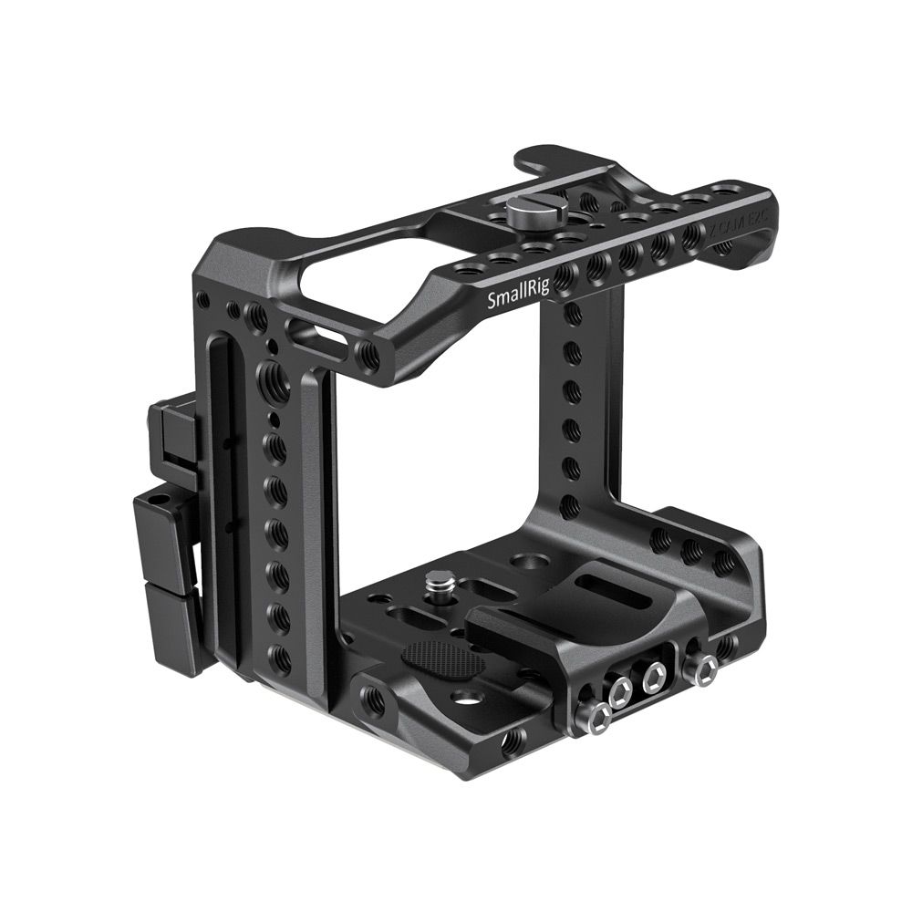 La jaula SmallRig para la Z CAM E2C CVZ2372 está diseñada para ofrecer protección y roscas de montaje para accesorios como monitores, micrófonos y empuñaduras. La jaula se fija a la cámara mediante tres tornillos de 1/4", uno en la parte superior y dos en la inferior, para evitar que se tuerza. Cuenta con varios orificios de posicionamiento de 1/4"-20 y Arri de 3/8" para fijar accesorios como el Cold Shoe 2260, la empuñadura superior 2165 y el soporte para monitor 2294. Ambos lados se integran con la barra Nato Handle 2187 y el Magic Arm 2116. Además, cuenta con orificios en la parte superior para la correa de transporte. En la parte inferior hay un destornillador plano y una llave hexagonal integrados para una instalación rápida. Según tus necesidades, hay disponible un soporte para adaptador de objetivo y una abrazadera para cables HDMI y USB.