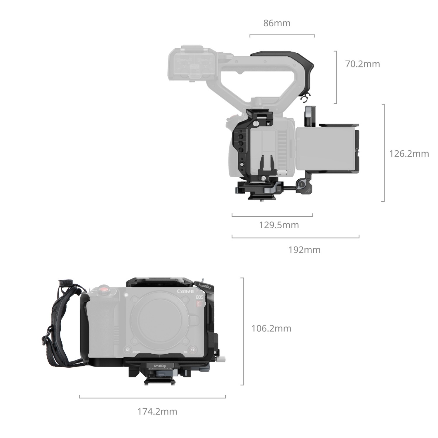 Kit SmallRig Cage para Canon EOS C50 (Edición Avanzada) 5658: Jaula integral de aluminio con placa de alimentación V-mount, extensión de empuñadura XLR, conector HDMI, riel NATO, correa de mano, placas Arca-Swiss, soporte para pantalla LCD y roscas universales para equipos cinematográficos profesionales de mano.