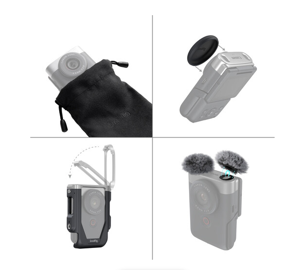 Mejora tu cámara Canon PowerShot V10 con el kit SmallRig Cage Kit, una jaula ligera de fibra compuesta que pesa 42 g, que incluye cuatro roscas de 1/4"-20, dos soportes de montura fría, dos protectores antiviento reutilizables (que reducen el ruido del viento hasta en 20 dB), dos adaptadores de montura fría, una tapa de silicona para el objetivo y una bolsa de almacenamiento; todo ello diseñado para ofrecer protección inmediata, un sonido mejorado y opciones de fijación ampliadas en un paquete compacto listo para vlogging, con dos años de garantía.