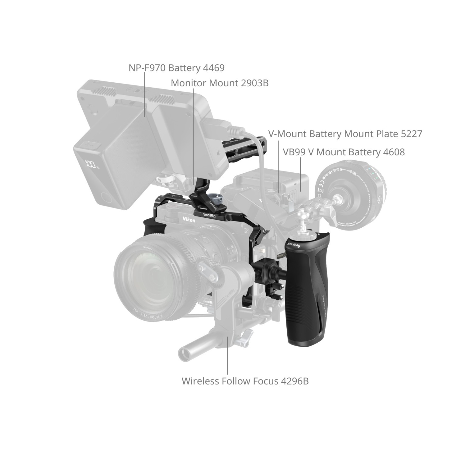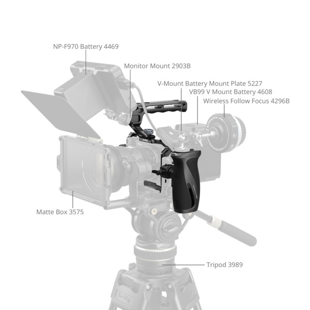 La jaula ofrece amplias posibilidades de ampliación, incluyendo varios orificios roscados de 1/4"-20 y orificios de posicionamiento para fijar accesorios, como asas laterales (ID 5532) o brazos mágicos (ID 5308, 4900). También está equipada con orificios de fijación ARRI de 3/8"-16 para montar soportes de monitor (ID 2903B) o asas superiores (ID 5252, 3765). Los soportes integrados para zapata fría permiten fijar micrófonos (compatibles con DJI MIC 2) o luces (ID 4660), mientras que la ranura QD inferior admite correas de hombro QD (ID 4118B). Además, las ranuras para correas admiten correas de muñeca (ID 3848) o correas de hombro (ID 4882, 5208).