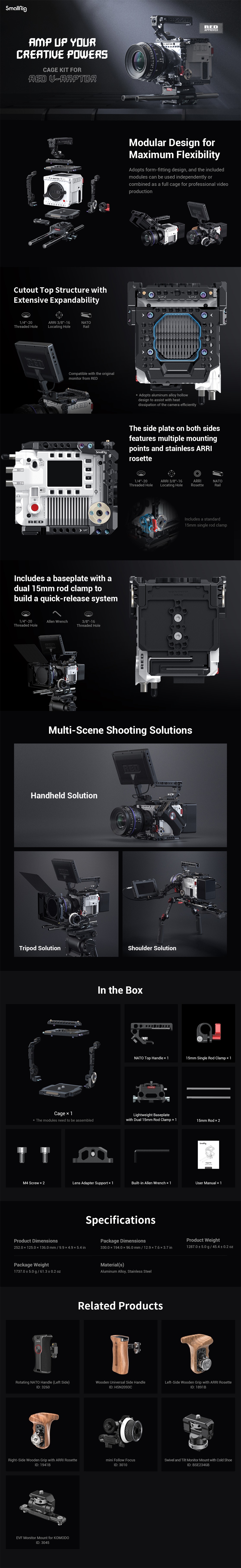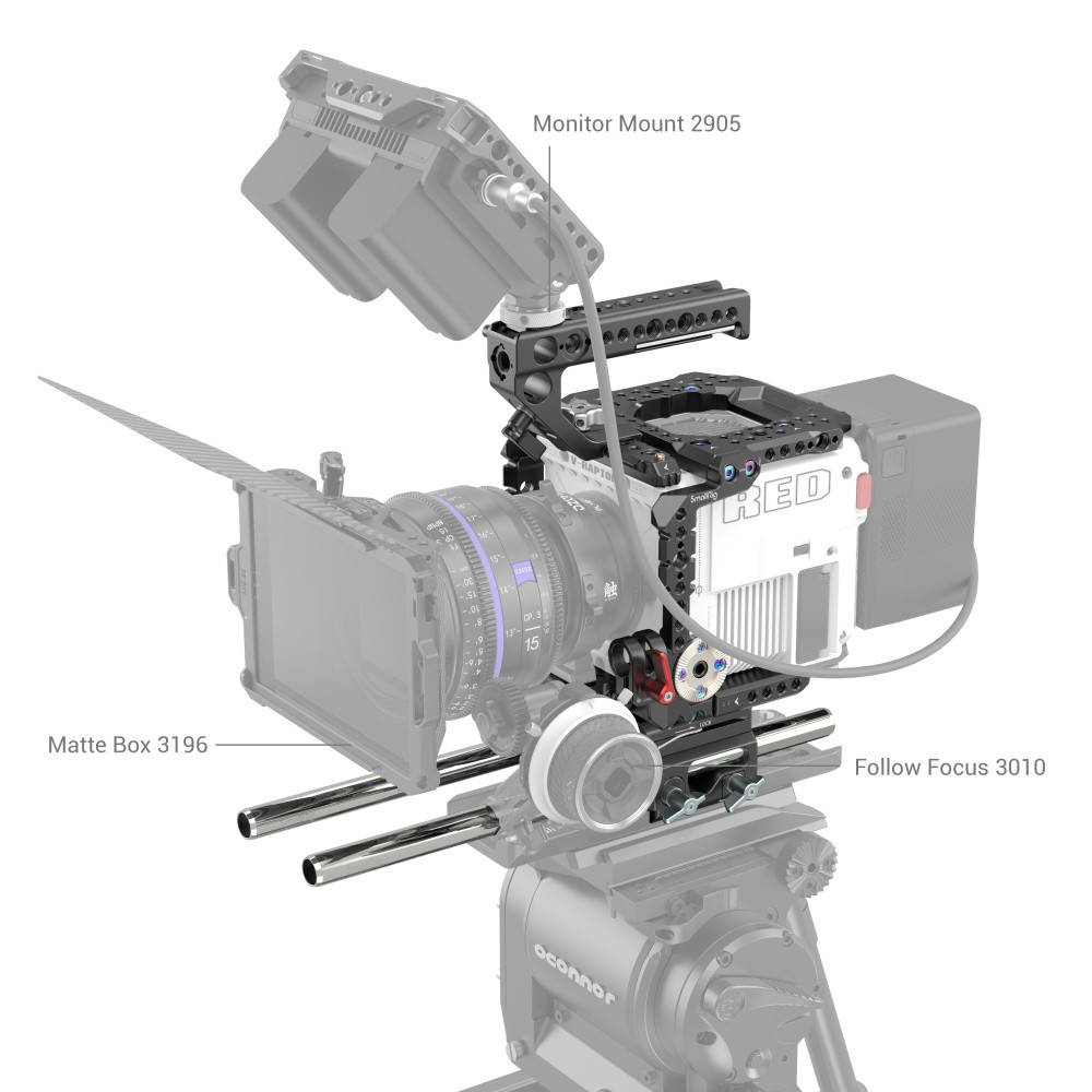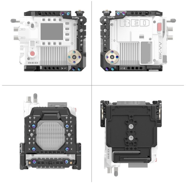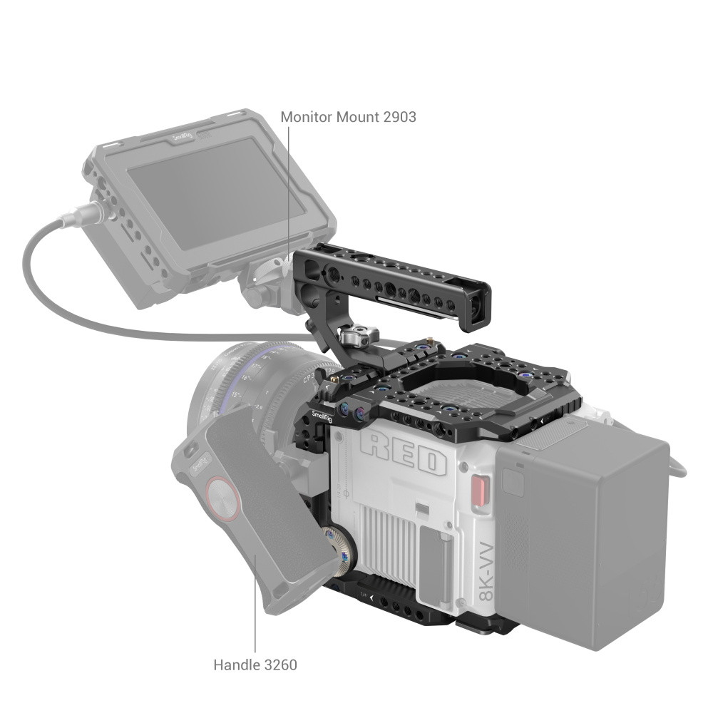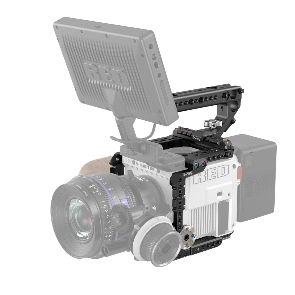 El kit SmallRig Cage para la cámara RED V-RAPTOR 3696 está diseñado para fijar accesorios y proteger la cámara. Gracias a su diseño modular, la placa superior o inferior funciona de forma independiente y ofrece una solución ligera para la grabación de vídeo. Su riel superior NATO se puede desmontar para permitir la instalación del monitor original DSMC3™ RED® Touch de 7" LCD. El kit se suministra con soportes para accesorios tales como orificios roscados de 1/4"-20, orificios roscados de 3/8"-16, orificios de posicionamiento ARRI de 3/8"-16, rieles NATO, soportes cold shoe, rosetas ARRI, abrazaderas de barra de 15 mm para el soporte de monitor 2905, empuñadura lateral con roseta ARRI 1941 / 1891, etc., para la producción de vídeo profesional. El soporte superior NATO con abrazadera de barra de 15 mm sostiene el monitor original.