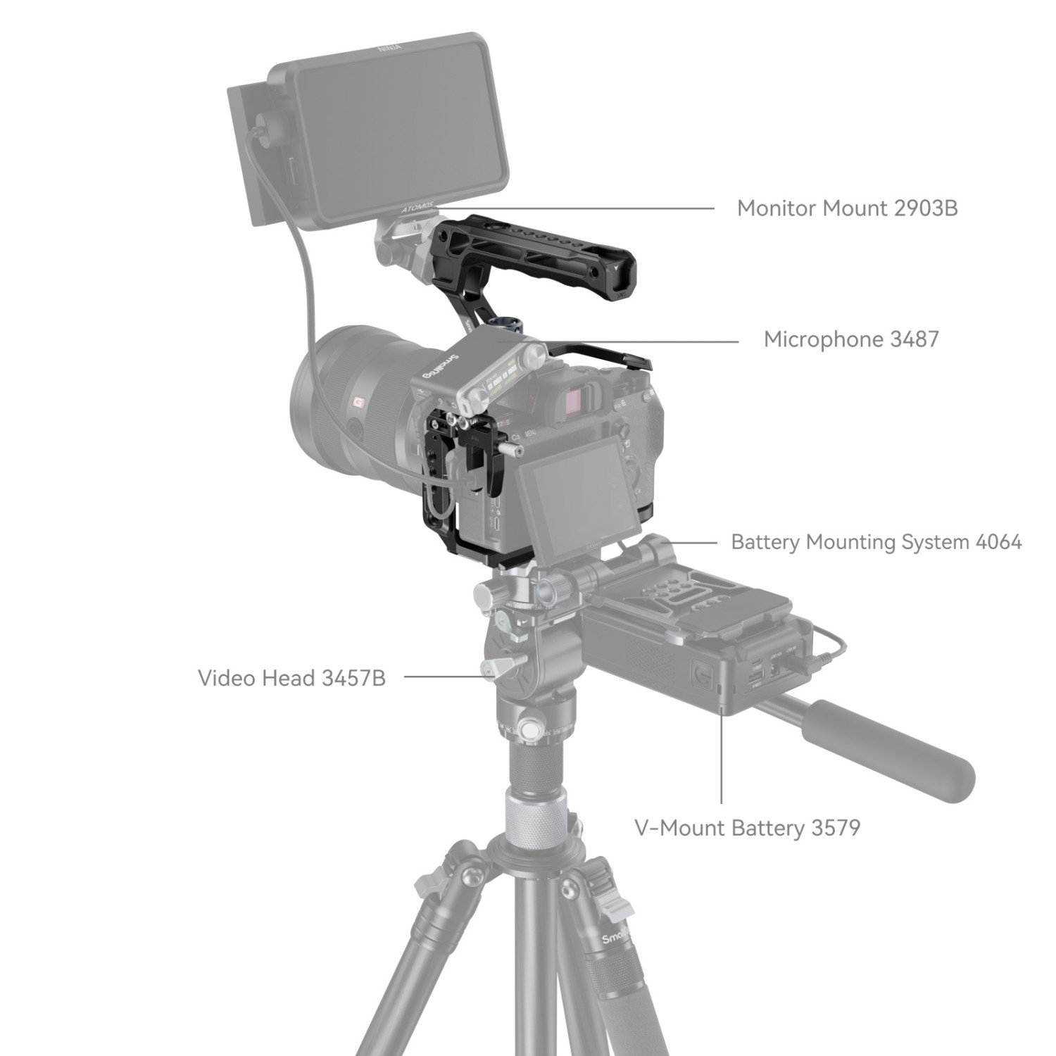 El kit SmallRig Cage Kit para Sony Alpha 7 III / Alpha 7R III 4198 está diseñado para facilitar la grabación desde ángulos bajos, proteger la cámara y, al mismo tiempo, ofrecer una amplia gama de puntos de fijación para accesorios. Incluye una jaula, una abrazadera para el cable HDMI y una empuñadura superior. La empuñadura superior es cómoda y permite un transporte fácil al grabar desde ángulos bajos. Los orificios roscados de 1/4"-20, los orificios de posicionamiento ARRI de 3/8"-16, las zapatas frías y los rieles NATO, así como el conector QD, admiten el soporte para monitor 2294, micrófonos, luces LED, el soporte para monitor 2903B y accesorios NATO.