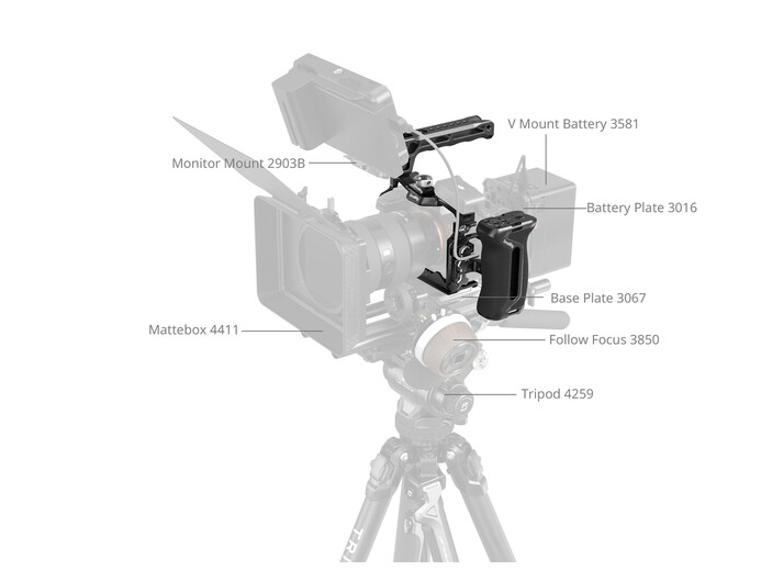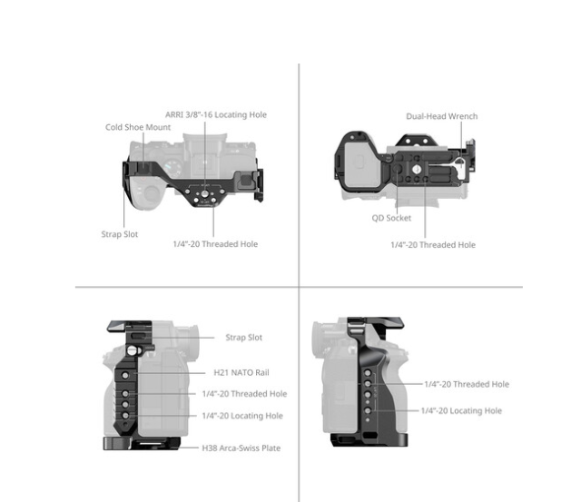 La jaula, fabricada en aleación de aluminio resistente y acero inoxidable, se ajusta perfectamente a la cámara y la protege, al tiempo que, gracias a su ingenioso diseño con bisagras, mantiene un acceso total a los puertos, los controles y el espacio para la batería. Las placas laterales dobles con bloqueo garantizan que la cámara permanezca firmemente en su sitio sin girar. La jaula está equipada con varias roscas ARRI antitorsión de 1/4"-20 y 3/8"-16, una barra NATO, un enchufe QD, orificios para correas y dos soportes para zapata fría, lo que ofrece amplias posibilidades para fijar accesorios como monitores, micrófonos y luces.
