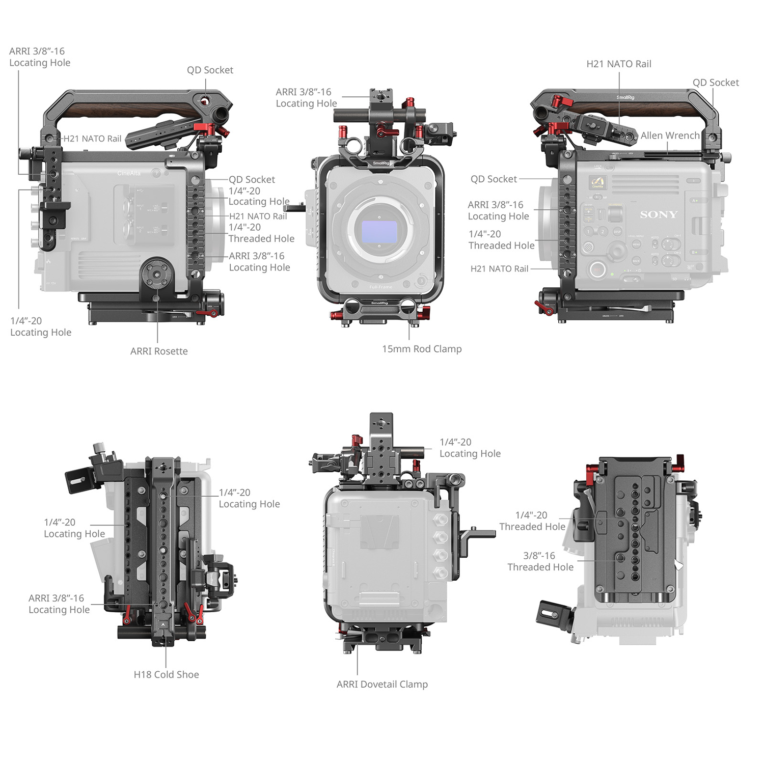 El kit SmallRig Cage Kit para la cámara Sony BURANO 4571 está diseñado para proteger la cámara Sony BURANO y fijar accesorios. Utiliza una estructura que cubre toda la superficie, lo que protege eficazmente el cuerpo de la cámara. La empuñadura superior presenta un diseño ergonómico y cómodo con material de madera para un agarre cómodo y una textura de primera clase; permite una instalación rápida y un ajuste hacia delante/atrás para facilitar el ajuste del centro de gravedad y un agarre más cómodo. Soporte para monitor que sustituye al soporte original para permitir un cambio rápido entre el modo LCD y el modo visor; el diseño HawkLock facilita el ajuste rápido. La abrazadera modular superior de 15 mm con doble barra es más adecuada para la fotografía a mano alzada, permite ampliar fácilmente el follow focus y otros accesorios; en comparación con el uso de la placa base LWS de 15 mm, el centro de gravedad es más bajo, lo que reduce la presión sobre el cabezal del trípode. Abrazadera para el cable HDMI que protege la interfaz y garantiza la estabilidad de la transmisión de la señal, y solución de consola de montaje para la transmisión inalámbrica de vídeo que permite una instalación compacta del sistema de transmisión inalámbrica. Placa base LWS de 15 mm con diseño de fijación rápida, que se puede montar rápidamente en la parte inferior de la jaula, ideal para cambiar entre múltiples escenas. El kit incluye orificios roscados ARRI 3/8"-16 integrados, orificios de posicionamiento 1/4"-20, orificios roscados 1/4"-20, orificios roscados 3/8"-16, conectores QD, rieles H21 NATO, pies de montaje H18, abrazadera ARRI Dovetail, etc. y, por lo tanto, puede ampliar la gama de accesorios para la creación profesional. El asa superior y la placa base LWS de 15 mm se desmontan e instalan rápidamente sin necesidad de herramientas, lo que facilita su almacenamiento y transporte.