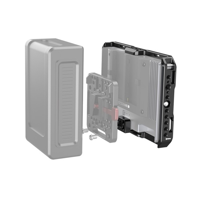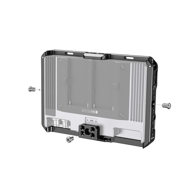La jaula SmallRig con parasol para el monitor táctil SmallHD 702 CMS2684 está diseñada para proporcionar una protección integral y puntos de fijación para accesorios al monitor. La jaula se fija al monitor mediante tres tornillos de 1/4”-20, uno en la parte superior y otro en la inferior, y uno en la parte trasera. Cuenta con múltiples roscas de 1/4”-20 y ARRI 3/8”-16 que permiten montar accesorios como el Magic Arm 2115, el soporte para monitor BSE2348 y el soporte para receptor inalámbrico 2107. La parte inferior cuenta con un riel NATO para accesorios compatibles con abrazaderas NATO que permiten desmontar rápidamente la configuración, como el soporte para monitor BSE2385. Se incluye un parasol específico para proteger contra el deslumbramiento al grabar en exteriores. La placa trasera es compatible con el soporte para batería V-Lock 1846 para acoplar una batería V-Mount. Cuenta con múltiples almohadillas de goma en el interior para evitar que el monitor se raye.