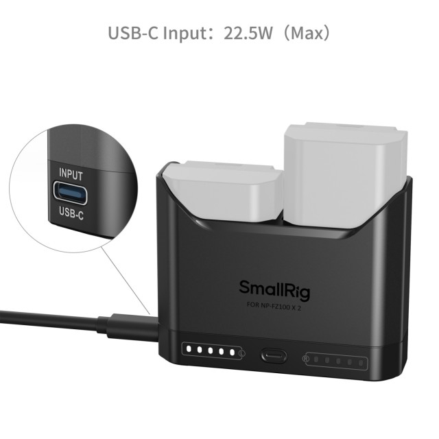 Cada canal de carga está equipado con cinco indicadores LED que muestran el nivel de carga en incrementos del 20 %, incluso sin alimentación externa. La luz roja se enciende cuando el nivel de carga de la batería es críticamente bajo. Además, el cargador cuenta con un puerto de entrada USB-C universal y se suministra con un cable de carga rápida, lo que lo hace compatible con adaptadores de red, cargadores para coche y baterías externas, lo que ofrece diversas opciones de carga.